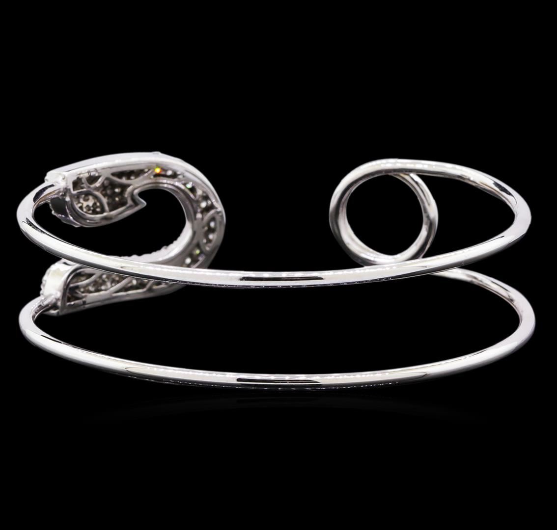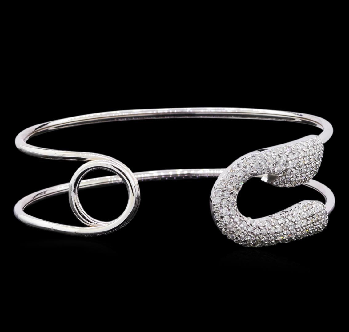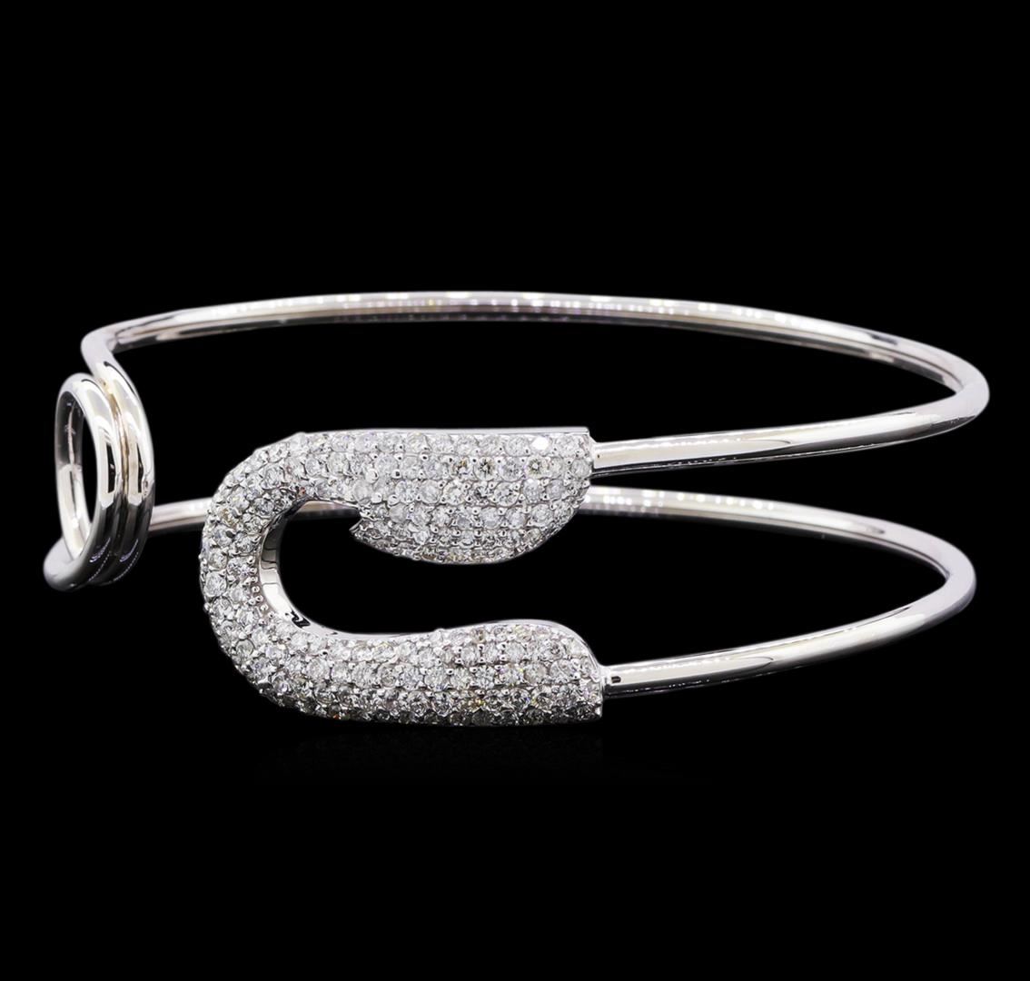 One electronically tested 14KT white gold lady's combination cast & assembled fashion cuff bracelet with a bright polish finish. The featured lady's bracelet has a safety pin motif and measures 7 inches in length. Identified with markings of "K14". Condition is new, good workmanship. Containing: Forty-Nine prong set round brilliant cut diamonds, measuring 1.40 - 1.35 x 0.84mm (depth est.) approximate total weight of 49 Stones = 0.46ct. Graded in the setting. Clarity: SI-1 to SI-2. Color: H - I. Cut Good One Hundred Ten prong set round brilliant cut diamonds, measuring 1.60 - 1.55 x 0.98mm (depth est.) approximate total weight of 110 Stones = 1.62ct. Graded in the setting. Clarity: SI-1 to SI-2. Color: H - I. Cut Good. Total Weight of Diamonds 2.08ct. Total Weight of Cuff Bracelet 15.00gm. GAS Appraised at $8,105.00.
