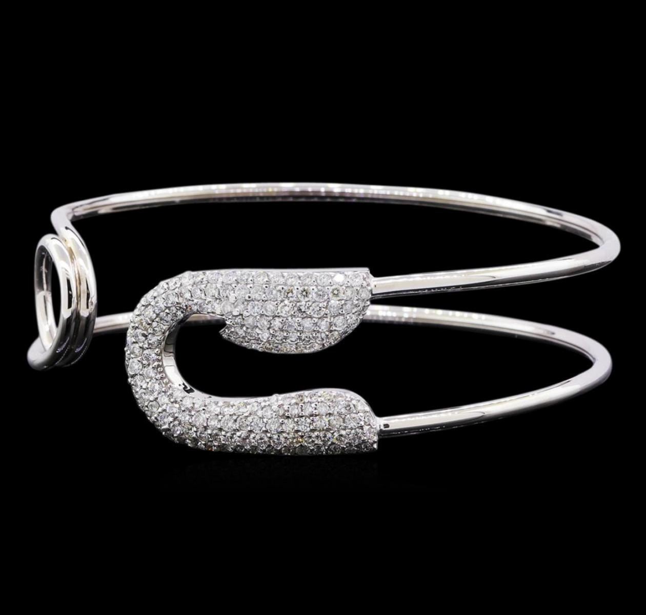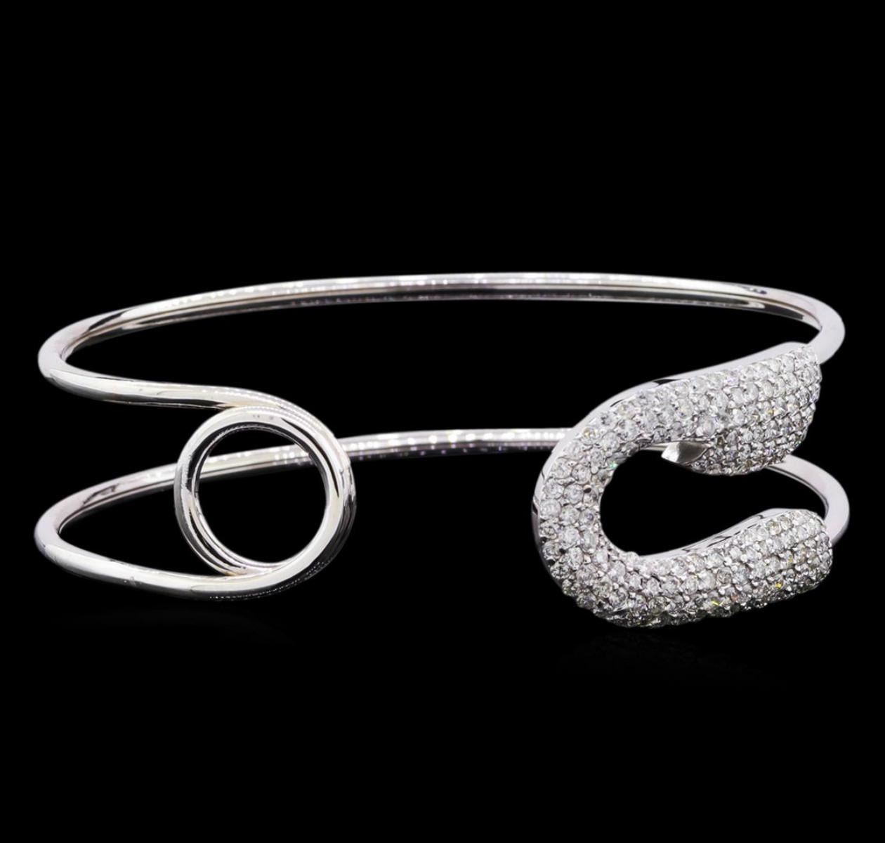 One electronically tested 14KT white gold lady's combination cast & assembled fashion cuff bracelet with a bright polish finish. The featured lady's bracelet has a safety pin motif and measures 7 inches in length. Identified with markings of "K14". Condition is new, good workmanship. Containing: Forty-Nine prong set round brilliant cut diamonds, measuring 1.40 - 1.35 x 0.84mm (depth est.) approximate total weight of 49 Stones = 0.46ct. Graded in the setting. Clarity: SI-1 to SI-2. Color: H - I. Cut Good One Hundred Ten prong set round brilliant cut diamonds, measuring 1.60 - 1.55 x 0.98mm (depth est.) approximate total weight of 110 Stones = 1.62ct. Graded in the setting. Clarity: SI-1 to SI-2. Color: H - I. Cut Good. Total Weight of Diamonds 2.08ct. Total Weight of Cuff Bracelet 15.00gm. GAS Appraised.