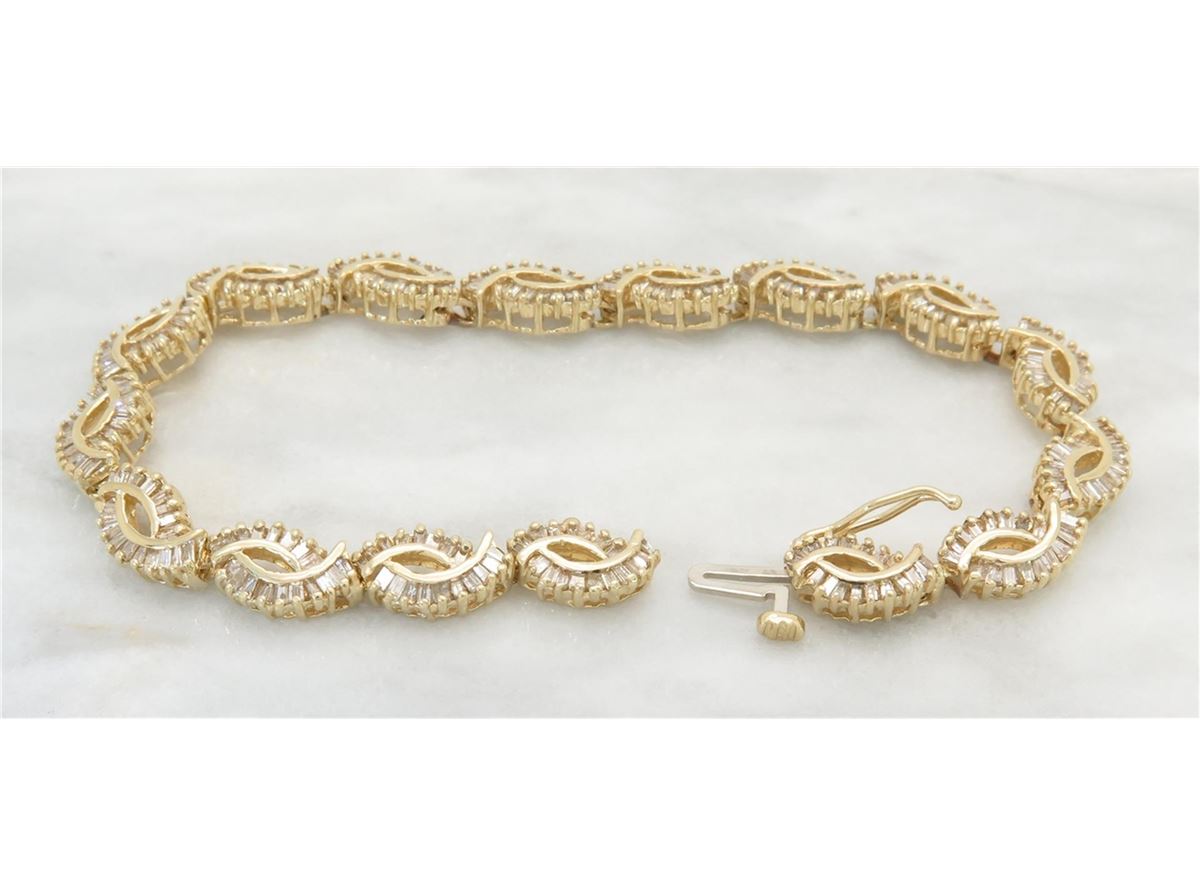 One tested 14K yellow gold diamond bracelet. Containing: 288 Baguette Cut Diamonds. Clarity: I, Color: H-J. Approximate total diamond weight: 2.08CTW. Diamonds are graded in the mounting, unless otherwise stated. Weight of bracelet: 15.3 grams. Size: 7" long.