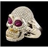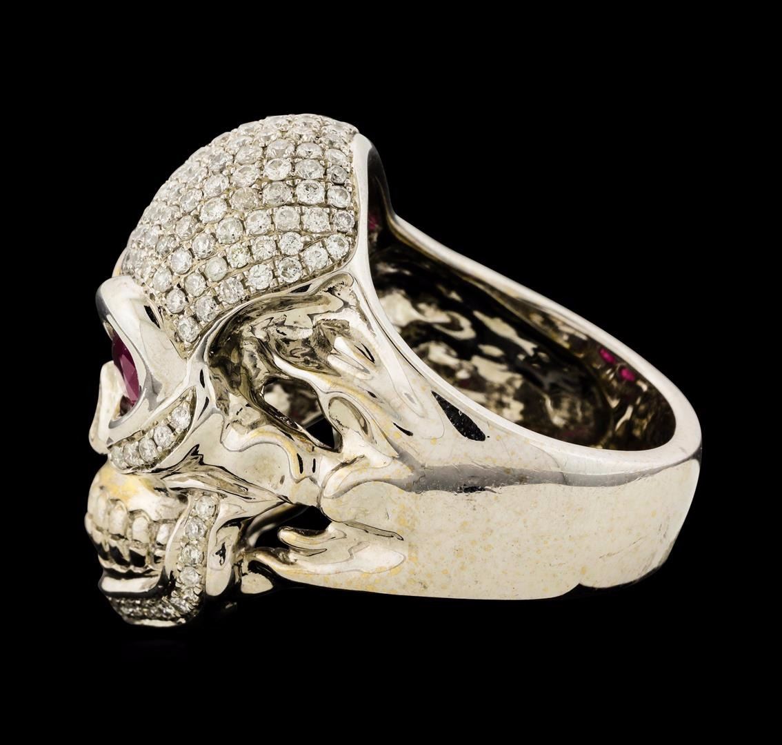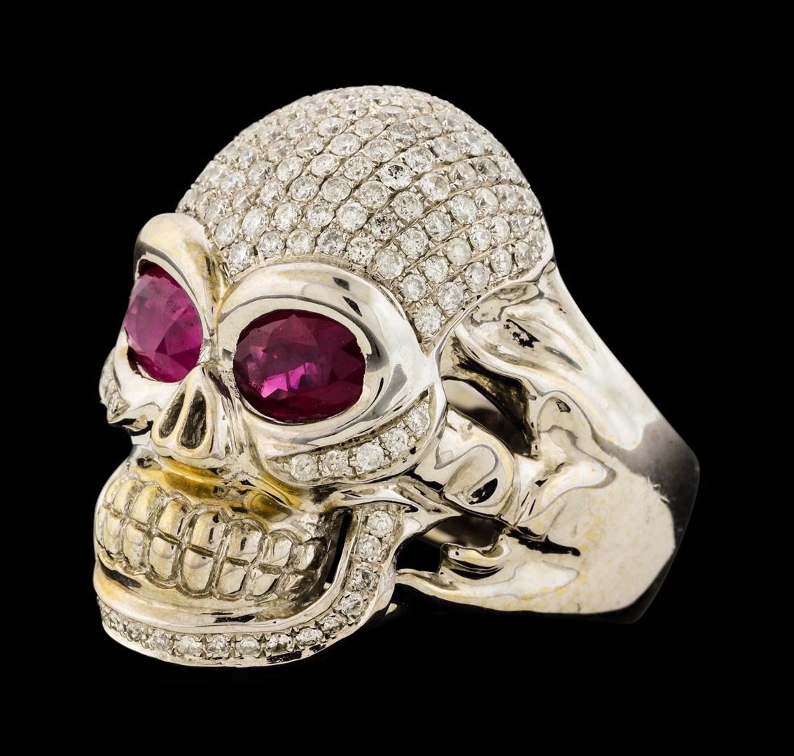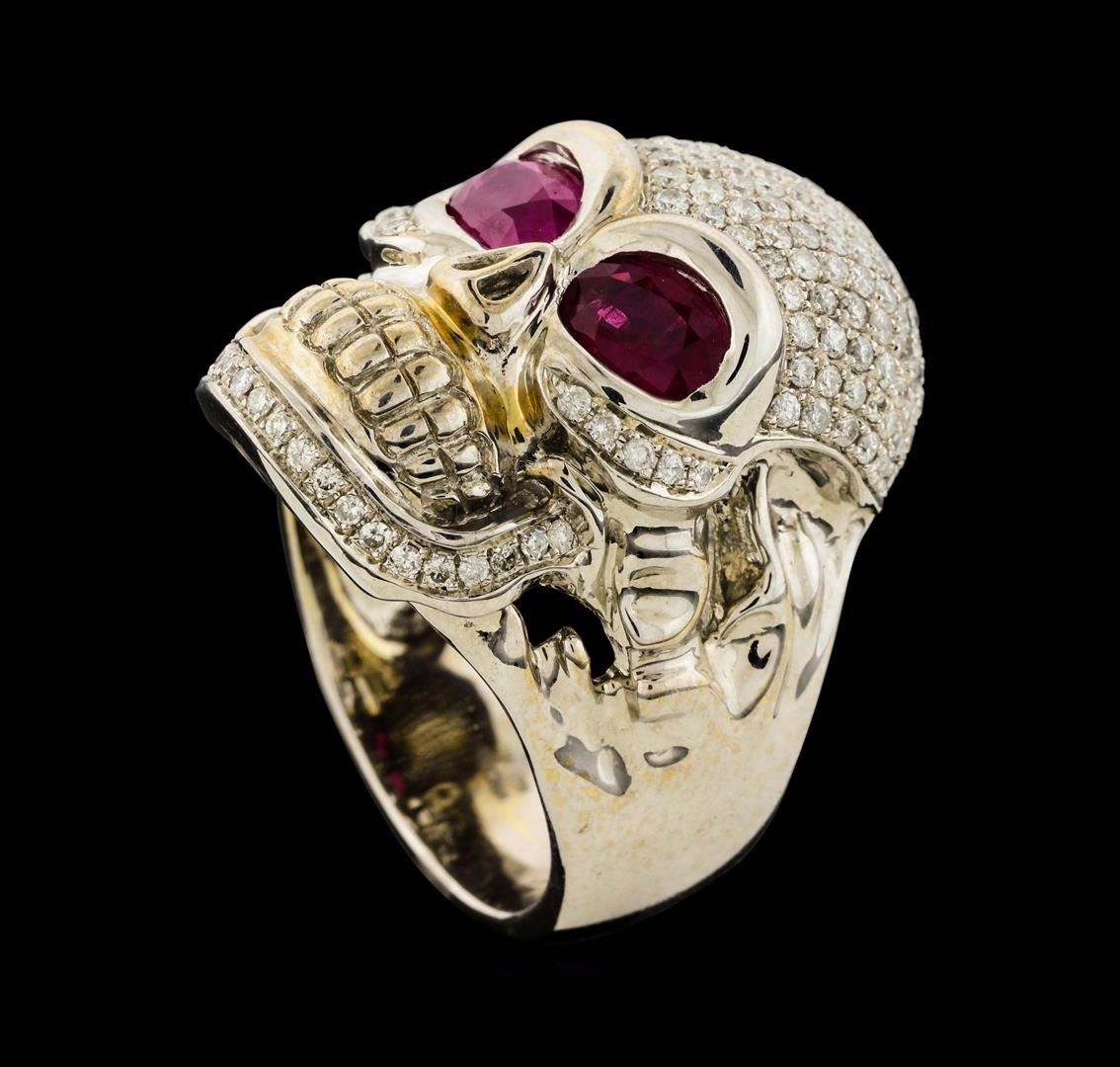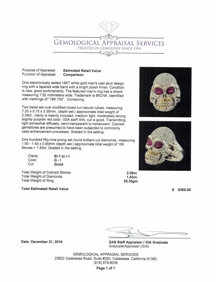 One electronically tested 18KT white gold man's cast skull design ring with a tapered wide band with a bright polish finish. The featured man's ring has a shank measuring 7.52 millimeters wide. Trademark is MICHA. Identified with markings of '18K 750'. Condition is new, good workmanship. Containing: Two bezel set oval modified mixed cut natural rubies, measuring 7.20 x 5.15 x 3.35mm, (depth est.) approximate total weight of 2.08ct., clarity is heavily included, medium light, moderately strong, slightly purplish red color, (GIA slpR 4/4), cut is good. Transmitting light somewhat diffusely, semi-transparent to translucent. Colored gemstones are presumed to have been subjected to commonly used enhancement processes. Graded in the setting. One Hundred Fifty-Nine prong set round brilliant cut diamonds, measuring 1.50 - 1.40 x 0.90mm (depth est.) approximate total weight of 159 Stones = 1.83ct. Graded in the setting. Clarity SI-1 to I-1. Color: G - I Cut Good. Total Weight of Colored Stones 2.08ct.. Total Weight of Diamonds 1.83ct.. Total Weight of Ring 25.30gm. GAS Appraised at $6,365.00.