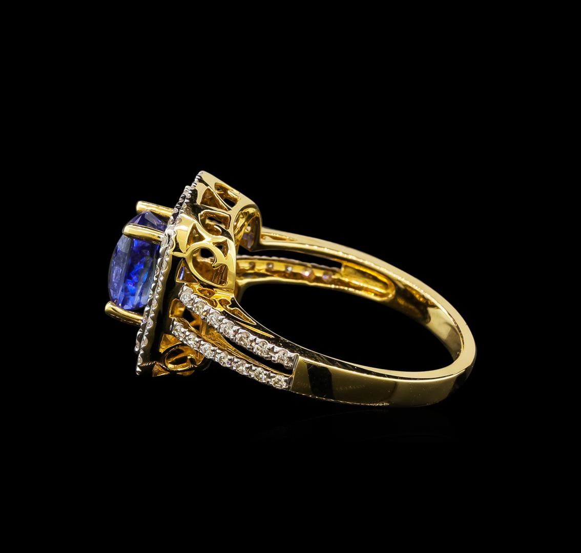 One electronically tested 14KT yellow gold lady's cast fashion ring with a cathedral split shank double halo with a bright polish finish. The featured lady's ring has a shank measuring 2.10 millimeters wide. Identified with markings of '14K'. Condition is new, good workmanship. Containing: One prong set rectangular cushion modified mixed cut natural blue sapphire, measuring 7.14 x 5.85 x 5.10mm, (depth est.) 5%. bulge factor, approximate weight of 2.08ct., clarity is eye clean, medium, moderately strong, blue color, (GIA B 5/4), cut is very good. Transmitting light with no distortion, transparent. Colored gemstones are presumed to have been subjected to commonly used enhancement processes. Graded in the setting. Sixteen prong set round brilliant cut diamonds, measuring 1.50 - 1.40 x 0.90mm (depth est.) approximate total weight of 16 Stones = 0.18ct. Graded in the setting. Clarity SI-1 to SI-2. Color: H - I Cut Good Fifty-Six prong set round brilliant cut diamonds, measuring 1.20 - 1.15 x 0.73mm (depth est.) approximate total weight of 56 Stones = 0.36ct. Graded in the setting. Clarity SI-1 to SI-2. Color: H - I Cut Good. Total Weight of Colored Stones 2.08ct.. Total Weight of Diamonds 0.54ct.. Total Weight of Ring 4.20gm. GAS Appraised at $11,755.00.