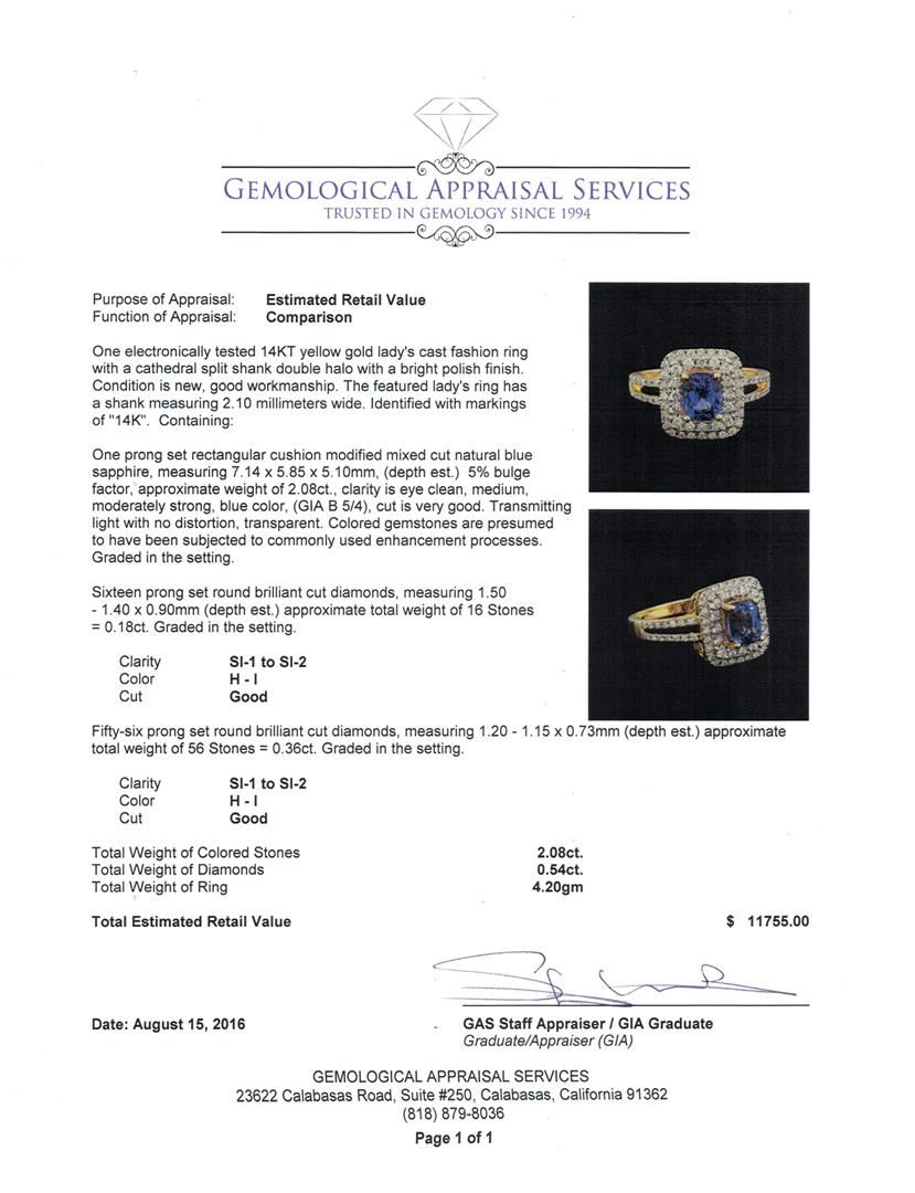 One electronically tested 14KT yellow gold lady's cast fashion ring with a cathedral split shank double halo with a bright polish finish. The featured lady's ring has a shank measuring 2.10 millimeters wide. Identified with markings of '14K'. Condition is new, good workmanship. Containing: One prong set rectangular cushion modified mixed cut natural blue sapphire, measuring 7.14 x 5.85 x 5.10mm, (depth est.) 5%. bulge factor, approximate weight of 2.08ct., clarity is eye clean, medium, moderately strong, blue color, (GIA B 5/4), cut is very good. Transmitting light with no distortion, transparent. Colored gemstones are presumed to have been subjected to commonly used enhancement processes. Graded in the setting. Sixteen prong set round brilliant cut diamonds, measuring 1.50 - 1.40 x 0.90mm (depth est.) approximate total weight of 16 Stones = 0.18ct. Graded in the setting. Clarity SI-1 to SI-2. Color: H - I Cut Good Fifty-Six prong set round brilliant cut diamonds, measuring 1.20 - 1.15 x 0.73mm (depth est.) approximate total weight of 56 Stones = 0.36ct. Graded in the setting. Clarity SI-1 to SI-2. Color: H - I Cut Good. Total Weight of Colored Stones 2.08ct.. Total Weight of Diamonds 0.54ct.. Total Weight of Ring 4.20gm. GAS Appraised at $11,755.00.