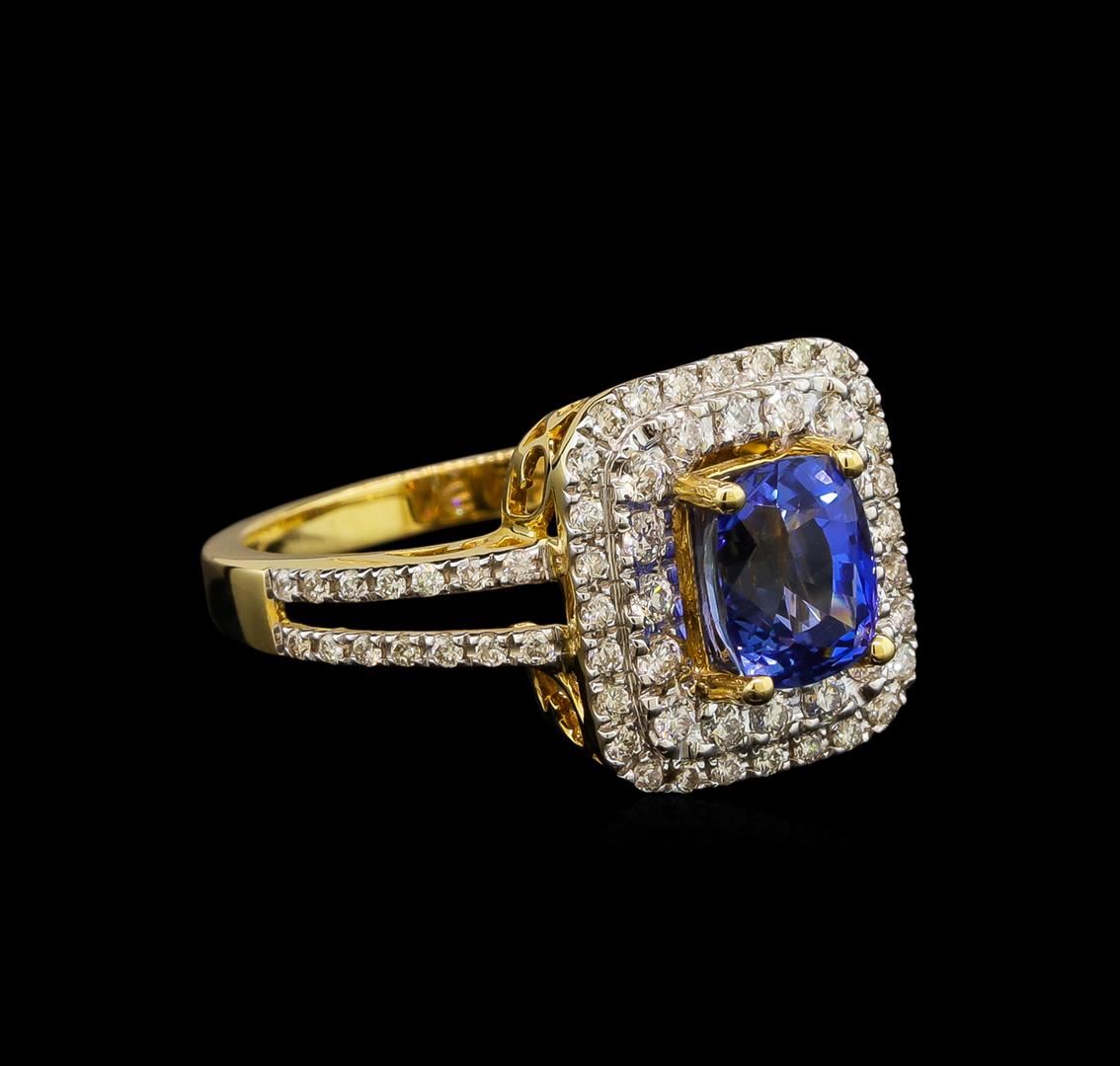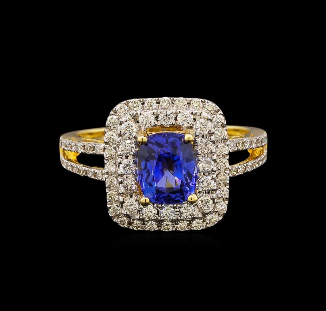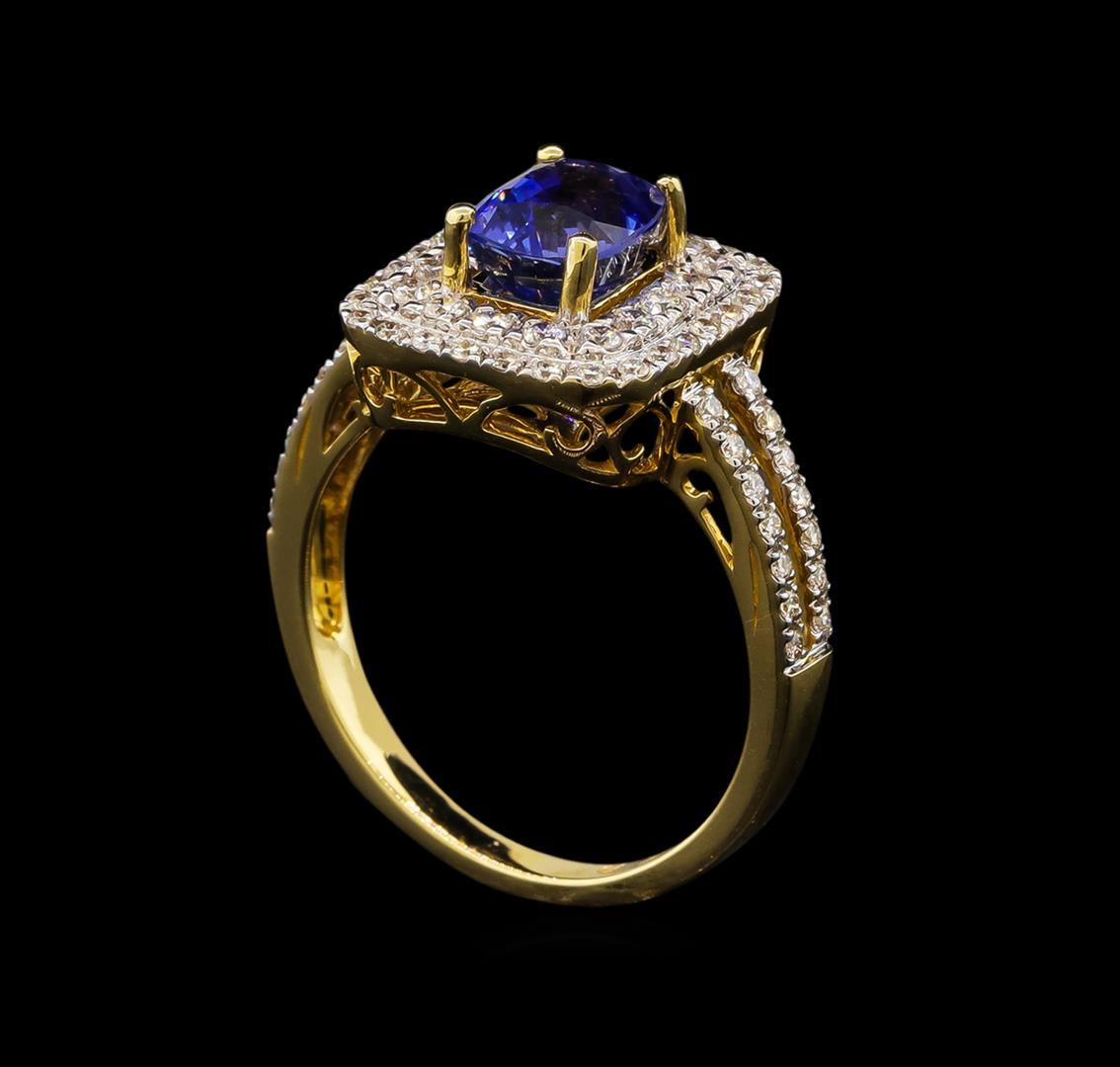 One electronically tested 14KT yellow gold lady's cast fashion ring with a cathedral split shank double halo with a bright polish finish. The featured lady's ring has a shank measuring 2.10 millimeters wide. Identified with markings of '14K'. Condition is new, good workmanship. Containing: One prong set rectangular cushion modified mixed cut natural blue sapphire, measuring 7.14 x 5.85 x 5.10mm, (depth est.) 5%. bulge factor, approximate weight of 2.08ct., clarity is eye clean, medium, moderately strong, blue color, (GIA B 5/4), cut is very good. Transmitting light with no distortion, transparent. Colored gemstones are presumed to have been subjected to commonly used enhancement processes. Graded in the setting. Sixteen prong set round brilliant cut diamonds, measuring 1.50 - 1.40 x 0.90mm (depth est.) approximate total weight of 16 Stones = 0.18ct. Graded in the setting. Clarity SI-1 to SI-2. Color: H - I Cut Good Fifty-Six prong set round brilliant cut diamonds, measuring 1.20 - 1.15 x 0.73mm (depth est.) approximate total weight of 56 Stones = 0.36ct. Graded in the setting. Clarity SI-1 to SI-2. Color: H - I Cut Good. Total Weight of Colored Stones 2.08ct.. Total Weight of Diamonds 0.54ct.. Total Weight of Ring 4.20gm. GAS Appraised at $11,755.00.