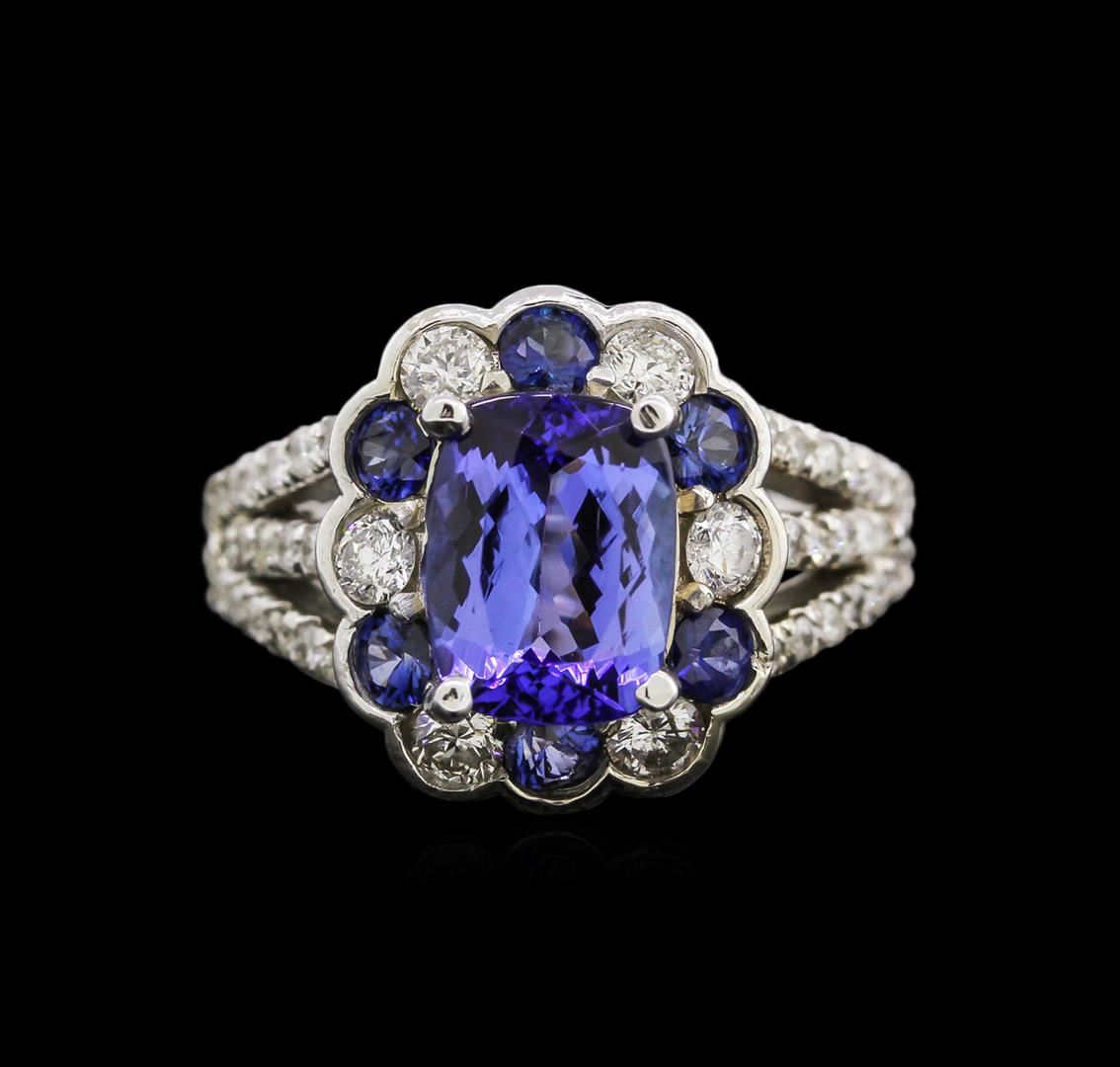 One electronically tested 14KT white gold lady's cast fashion ring with a cathedral shank with a bright polish finish. The featured lady's ring has a shank measuring 1.83 millimeters wide. Identified with markings of "K14". Condition is new, good workmanship. Containing: One prong set rectangular cushion modified brilliant cut natural tanzanite, measuring 9.09 x 6.78 x 4.18mm, 3% bulge factor, approximate weight of 2.08ct., clarity is eye clean, type I, medium dark, very slightly grayish, violetish blue color, (GIA vB 6/3), cut is good. Transmitting light with no distortion, transparent. Colored gemstones are presumed to have been subjected to commonly used enhancement processes. Graded in the setting. Six prong set round brilliant cut diamonds, measuring 2.60 - 2.55 x 1.55mm (depth est.) approximate total weight of 6 Stones = 0.39ct. Graded in the setting. Clarity: SI-2 to I-1. Color: H - I. Cut Good Forty-Eight prong set round brilliant cut diamonds, measuring 1.40 - 1.30 x 0.88mm (depth est.) approximate total weight of 48 Stones = 0.48ct. Graded in the setting. Clarity: SI-2 to I-1. Color: H - I. Cut Good Six prong set round brilliant cut natural blue sapphires, measuring 2.70 - 2.60 x 1.72 mm, approximate total weight of 0.56ct., clarity is slightly included, type II, medium dark, strong, blue color, (GIA B 6/5), cut is good. Transmitting light somewhat diffusely, transparent to translucent. Naturally occurring internal & external characteristics are present. Indications of laboratory high temperature heat treatment. Graded in the setting. Total Weight of Colored Stones 2.64ct. Total Weight of Diamonds 0.87ct. Total Weight of Ring 5.90gm. GAS Appraised at $6,275.00.