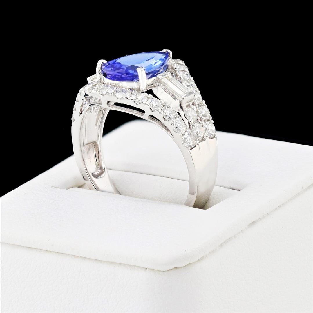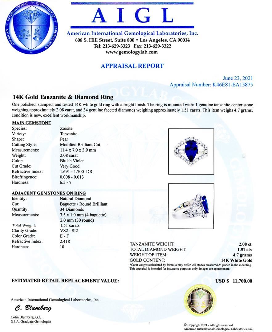 2.08ct Tanzanite and 1.51ctw Diamond 14K White Gold Ring. Please see Photos and Description for all available information. This stunning ring features a 2.08ct oval tanzanite center stone surrounded by 34 round diamonds with a total weight of 1.51ct. The oval tanzanite is set in a 14K white gold ring and encircled with round diamonds and finished with high polished edges. This ring is available in size 6 3/4