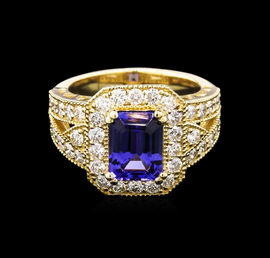 One electronically tested 14KT yellow gold lady's cast fashion ring with a split shank with a bright polish with milgrain detailing finish. The featured lady's ring has a shank measuring 4.25 millimeters wide. Identified with markings of "K14". Condition is new, good workmanship. Containing: One prong set emerald step cut natural tanzanite, measuring 8.73 x 6.52 x 4.17mm, approximate weight of 2.08ct., clarity is eye clean, type I, medium, very slightly grayish, violetish blue color, (GIA vB 5/3), cut is good. Transmitting light with no distortion, transparent. Colored gemstones are presumed to have been subjected to commonly used enhancement processes. Graded in the setting. Forty prong set round brilliant cut diamonds, measuring 2.10 - 2.00 x 1.31mm (depth est.) approximate total weight of 40 Stones = 1.35ct. Graded in the setting. Clarity: SI-2 to I-1. Color: H - I. Cut Good. Total Weight of Colored Stones 2.08ct. Total Weight of Diamonds 1.35ct. Total Weight of Ring 7.60gm. GAS Appraised.