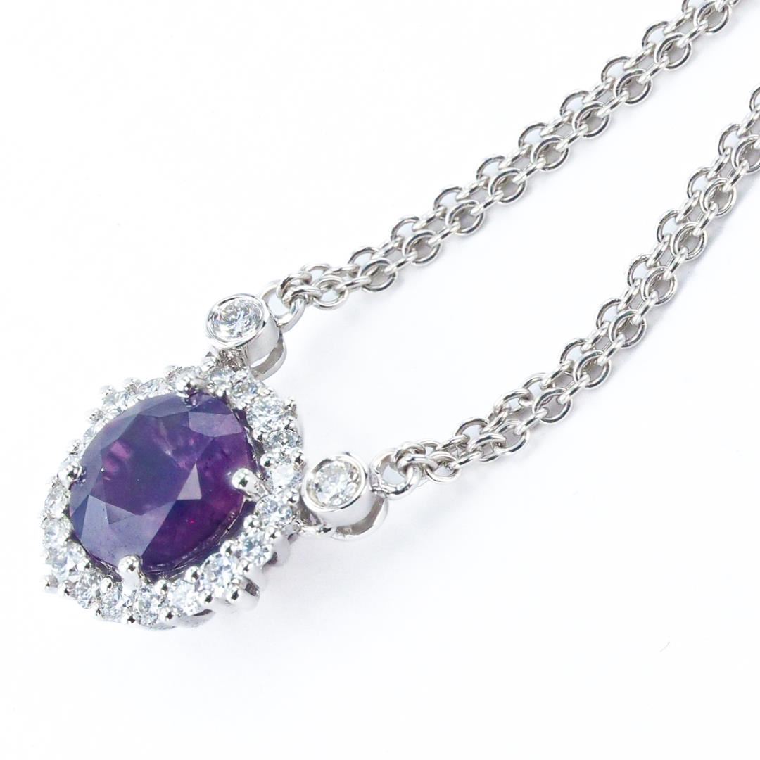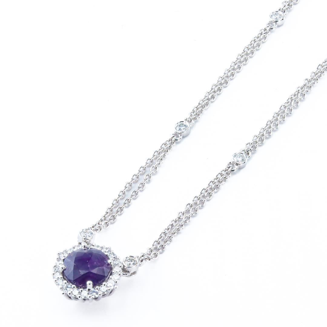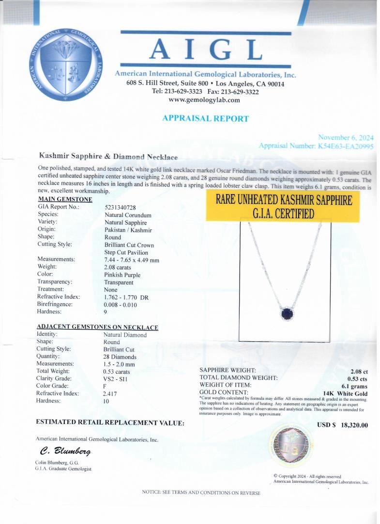 One polished, stamped, and tested 14K white gold link necklace marked Oscar Friedman. The necklace is mounted with: 1 genuine GIA certified unheated sapphire center stone weighing 2.08 carats, and 28 genuine round diamonds weighing approximately 0.53 carats. The necklace measures 16 inches in length and is finished with a spring loaded lobster claw clasp. This item weighs 6.1 grams, condition is new, excellent workmanship. #MAIN GEMSTONE# GIA Report No.: 5231340728 Species: Natural Corundum Variety: Natural Sapphire Origin: Pakistan / Kashmir Shape: Round Cutting Style: Brilliant Cut Crown, Step Cut Pavilion Measurements: 7.44 - 7.65 x 4.49mm Weight: 2.08 carats Color: Pinkish Purple Transparency: Transparent Treatment: None Refractive Index: 1.762 - 1.770 DR Birefringence: 0.008 - 0.010 Hardness 9 #ADJACENT GEMSTONES ON NECKLACE# Identity: Natural Diamond Shape: Round Cutting Style: Brilliant Cut Quantity: 28 Diamonds Measurements: 1.5 - 2.0mm Total Weight: 0.53 carats Clarity Grade: VS2-SI1 Color Grade: F Refractive Index: 2.417 Hardness 10 SAPPHIRE WEIGHT: 2.08 ct TOTAL DIAMOND WEIGHT: 0.53 cts WEIGHT OF ITEM: 6.1 grams GOLD CONTENT: 14K White Gold Size: 16