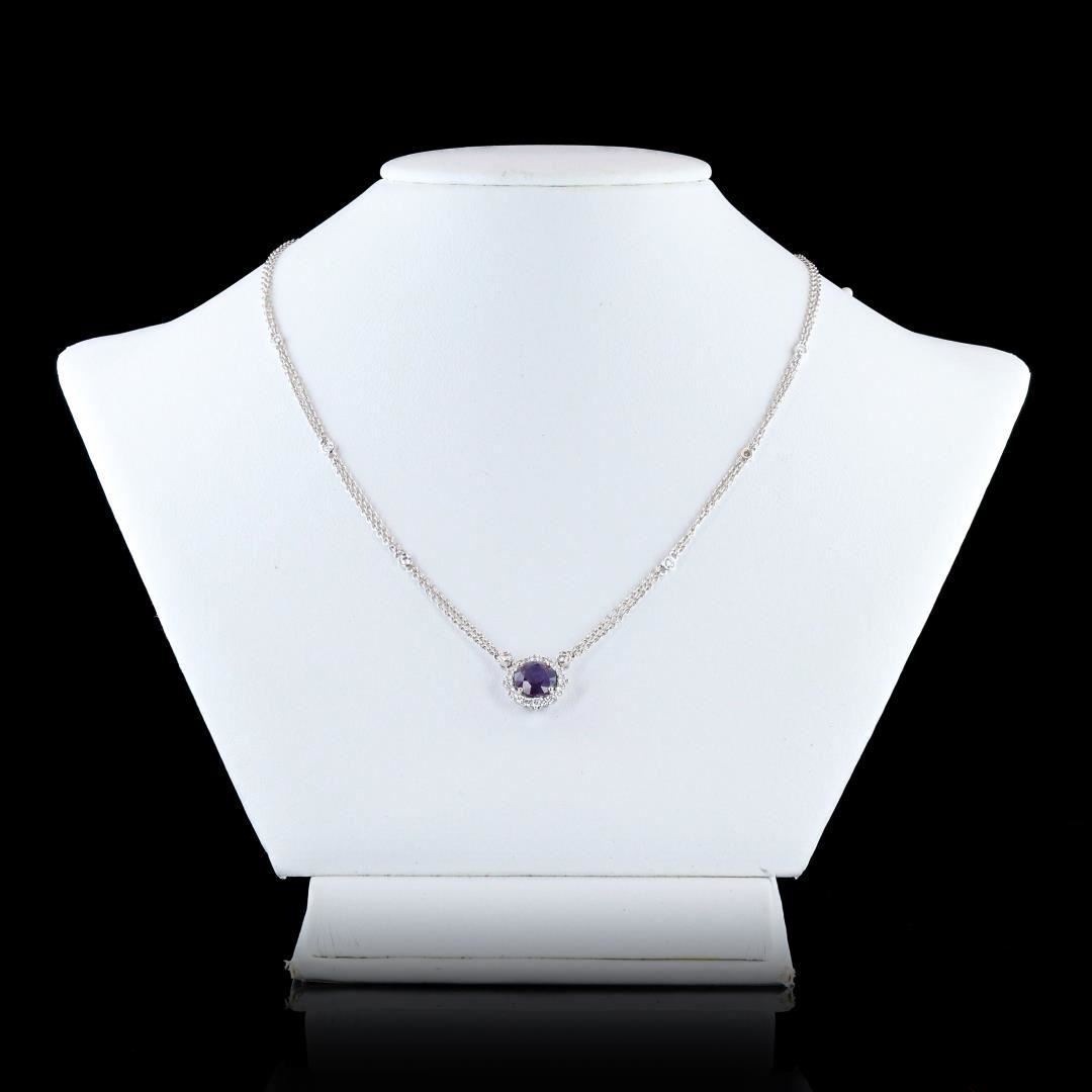 One polished, stamped, and tested 14K white gold link necklace marked Oscar Friedman. The necklace is mounted with: 1 genuine GIA certified unheated sapphire center stone weighing 2.08 carats, and 28 genuine round diamonds weighing approximately 0.53 carats. The necklace measures 16 inches in length and is finished with a spring loaded lobster claw clasp. This item weighs 6.1 grams, condition is new, excellent workmanship. #MAIN GEMSTONE# GIA Report No.: 5231340728 Species: Natural Corundum Variety: Natural Sapphire Origin: Pakistan / Kashmir Shape: Round Cutting Style: Brilliant Cut Crown, Step Cut Pavilion Measurements: 7.44 - 7.65 x 4.49mm Weight: 2.08 carats Color: Pinkish Purple Transparency: Transparent Treatment: None Refractive Index: 1.762 - 1.770 DR Birefringence: 0.008 - 0.010 Hardness 9 #ADJACENT GEMSTONES ON NECKLACE# Identity: Natural Diamond Shape: Round Cutting Style: Brilliant Cut Quantity: 28 Diamonds Measurements: 1.5 - 2.0mm Total Weight: 0.53 carats Clarity Grade: VS2-SI1 Color Grade: F Refractive Index: 2.417 Hardness 10 SAPPHIRE WEIGHT: 2.08 ct TOTAL DIAMOND WEIGHT: 0.53 cts WEIGHT OF ITEM: 6.1 grams GOLD CONTENT: 14K White Gold Size: 16