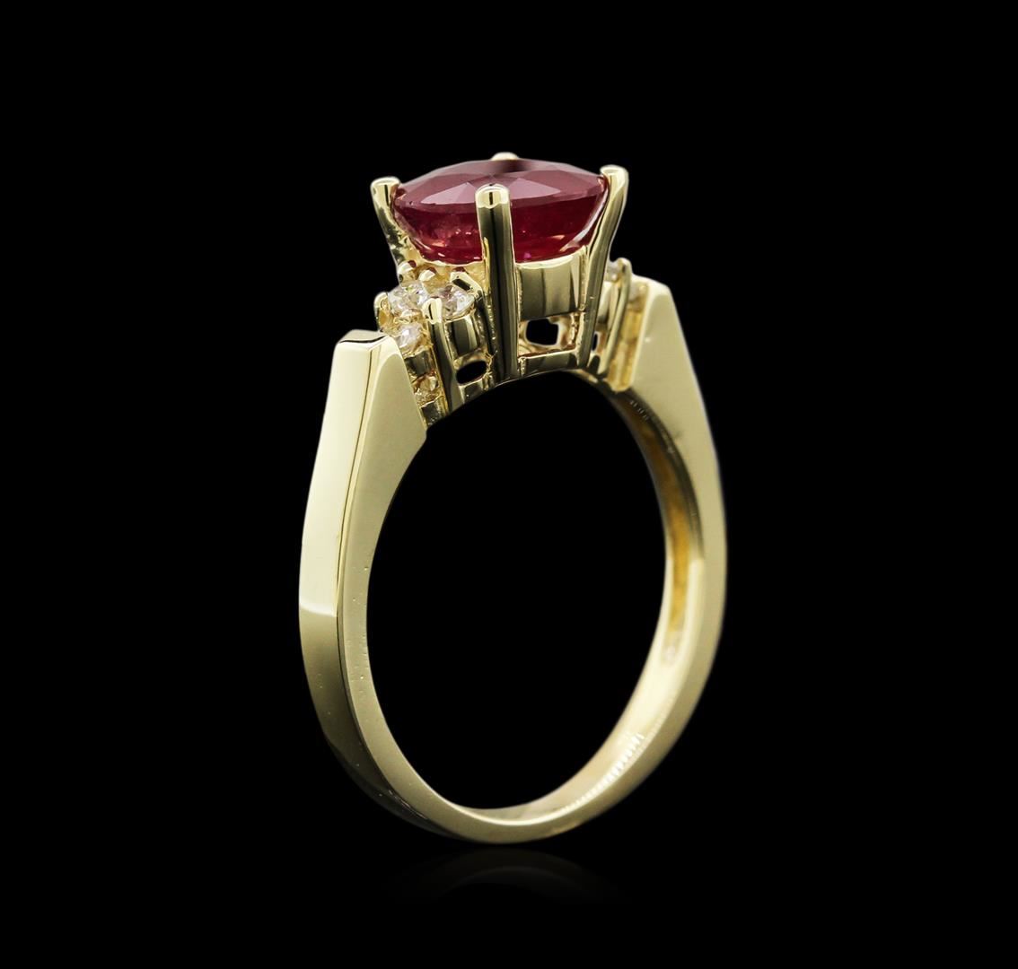 One electronically tested 14KT yellow gold lady's cast fashion ring with a cathedral shank with a bright polish finish. The featured ring has a 2.18mm shank Identified with markings of "K14". Condition is new, good workmanship. Containing: One prong set oval modified brilliant cut natural ruby, measuring 8.28 x 8.25 x 4.10mm, approximate weight of 2.08ct., clarity is heavily included, type II, dark, very slightly brownish, slightly purplish red color, (GIA slpR 7/3), cut is good. Colored gemstones are presumed to have been subjected to commonly used enhancement processes. Indications of laboratory high temperature heat treatment, with glass & flux additives. Graded in the setting. Six prong set round brilliant cut diamonds, measuring 2.30 - 2.25 x 1.48mm (depth est.) approximate total weight of 6 Stones = 0.26ct. Graded in the setting. Clarity: SI-1 to SI-2. Color: H - I. Cut Good. Total Weight of Colored Stones 2.08ct. Total Weight of Diamonds 0.26ct. Total Weight of Ring 4.60gm. GAS Appraised at $2,385.00.