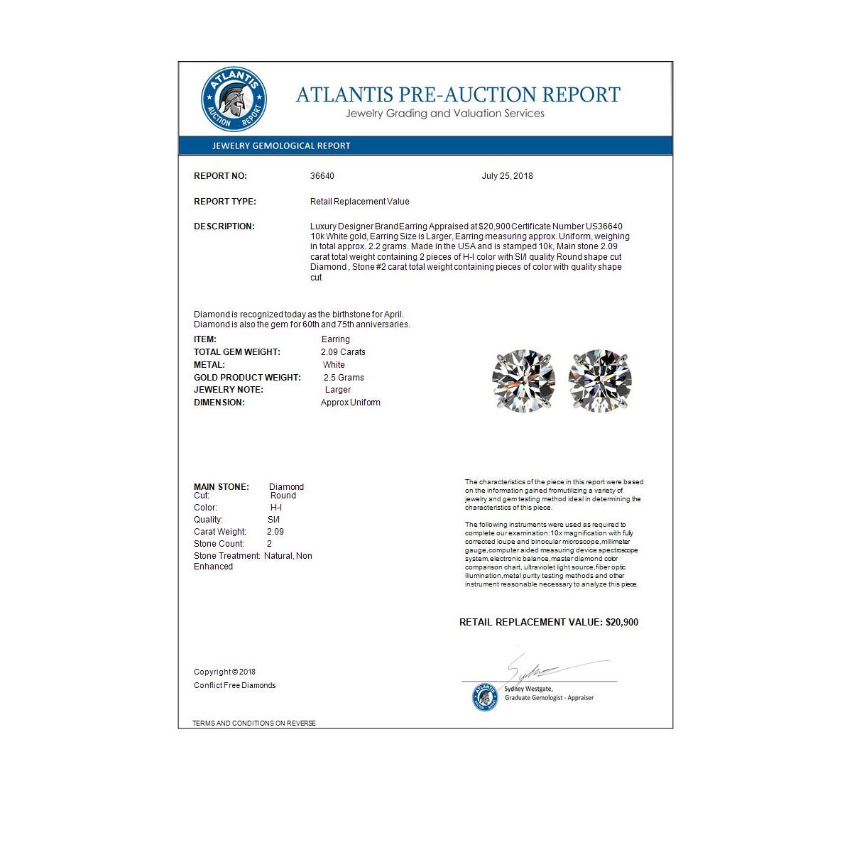 REF-285M2H -36640 ---- 2.09 CTW Certified H-SI/I Quality Diamond Solitaire Stud Earrings 10K White Gold ---- Luxury Designer Brand Earring Appraised at $20,900 Certificate Number US36640 10k White gold, Earring Size is Larger, Earring measuring approx. Uniform, weighing in total approx. 2.2 grams. Made in the USA and is stamped 10k, Main stone 2.09 carat total weight containing 2 pieces of H-I color with SI/I quality Round shape cut Diamond , Stone #2 carat total weight containing pieces of color with quality shape cut