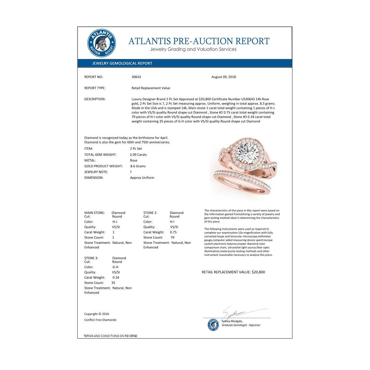 REF-420F2N -30643 ---- 2.09 CTW Certified VS/SI Diamond 2Pc Wedding Set Solitaire Halo 14K Rose Gold ---- Luxury Designer Brand 2 Pc Set Appraised at $20,800 Certificate Number US30643 14k Rose gold, 2 Pc Set Size is 7, 2 Pc Set measuring approx. Uniform, weighing in total approx. 8.3 grams. Made in the USA and is stamped 14k, Main stone 1 carat total weight containing 1 pieces of H-J color with VS/SI quality Round shape cut Diamond , Stone #2 0.75 carat total weight containing 79 pieces of H-I color with VS/SI quality Round shape cut Diamond , Stone #3 0.34 carat total weight containing 35 pieces of G-H color with VS/SI quality Round shape cut Diamond