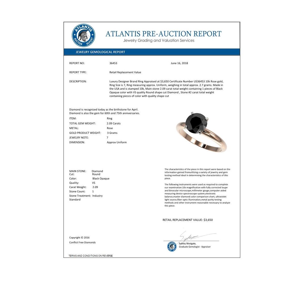 REF-60H2A -36453 ---- 2.09 CTW Fancy Black VS Diamond Solitaire Engagement Ring 10K Rose Gold ---- Luxury Designer Brand Ring Appraised at $3,650 Certificate Number US36453 10k Rose gold, Ring Size is 7, Ring measuring approx. Uniform, weighing in total approx. 2.7 grams. Made in the USA and is stamped 10k, Main stone 2.09 carat total weight containing 1 pieces of Black Opaque color with VS quality Round shape cut Diamond , Stone #2 carat total weight containing pieces of color with quality shape cut