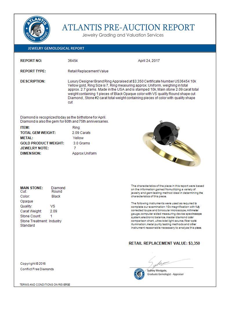 2.09 CTW Fancy Black VS Diamond Solitaire Engagement Ring 10K Yellow Gold ---- Luxury Designer Brand Ring Appraised Retail Price at $3,350 ---- SKU Number US36454 10k Yellow gold Ring Size is 7, Ring measuring approx. Uniform, weighing in total approx. 2.7 grams. Made in the USA and is stamped 10k, Main stone 2.09 carat total weight containing 1 pieces of Black Opaque color with VS quality Round shape cut Diamond , Stone #2 carat total weight containing pieces of color with quality shape cut