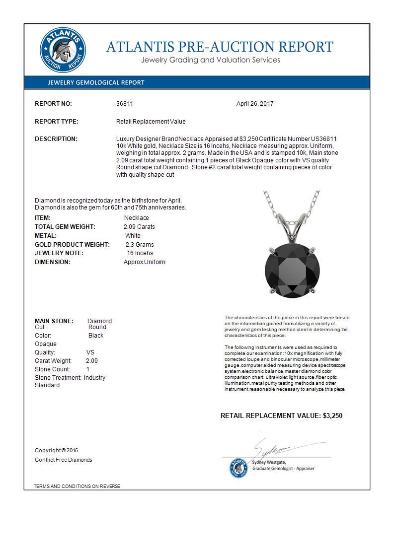 2.09 CTW Fancy Black VS Diamond Solitaire Necklace 10K White Gold ---- Luxury Designer Brand Necklace Appraised Retail Price at $3,250 ---- SKU Number US36811 10k White gold Necklace Size is 16 Incehs, Necklace measuring approx. Uniform, weighing in total approx. 2 grams. Made in the USA and is stamped 10k, Main stone 2.09 carat total weight containing 1 pieces of Black Opaque color with VS quality Round shape cut Diamond , Stone #2 carat total weight containing pieces of color with quality shape cut