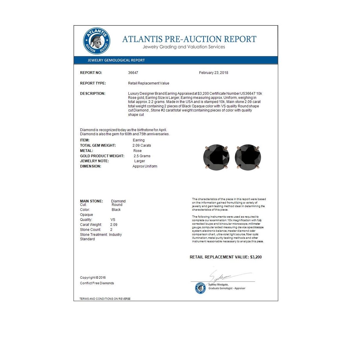 REF-43H5A -36647 ---- 2.09 CTW Fancy Black VS Diamond Solitaire Stud Earrings 10K Rose Gold ---- Luxury Designer Brand Earring Appraised at $3,200 Certificate Number US36647 10k Rose gold, Earring Size is Larger, Earring measuring approx. Uniform, weighing in total approx. 2.2 grams. Made in the USA and is stamped 10k, Main stone 2.09 carat total weight containing 2 pieces of Black Opaque color with VS quality Round shape cut Diamond , Stone #2 carat total weight containing pieces of color with quality shape cut