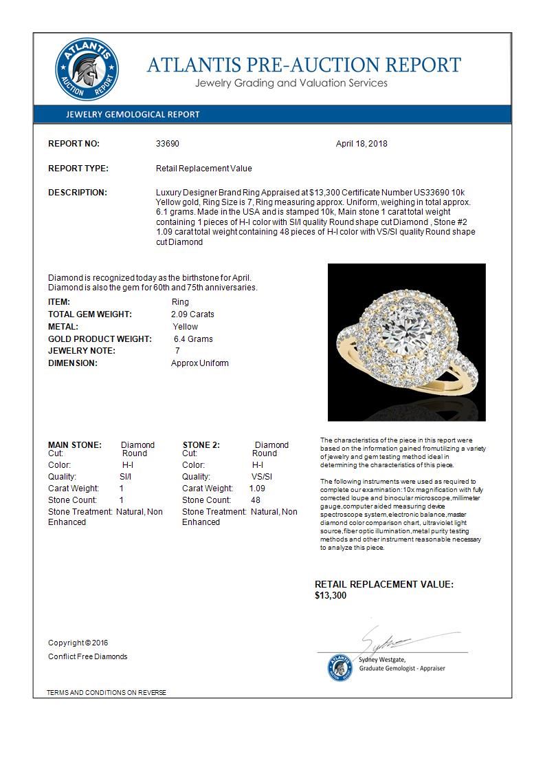 REF-220M2H -33690 ---- 2.09 CTW H-SI/I Certified Diamond Solitaire Halo Ring 10K Yellow Gold ---- Luxury Designer Brand Ring Appraised at $13,300 Certificate Number US33690 10k Yellow gold, Ring Size is 7, Ring measuring approx. Uniform, weighing in total approx. 6.1 grams. Made in the USA and is stamped 10k, Main stone 1 carat total weight containing 1 pieces of H-I color with SI/I quality Round shape cut Diamond , Stone #2 1.09 carat total weight containing 48 pieces of H-I color with VS/SI quality Round shape cut Diamond