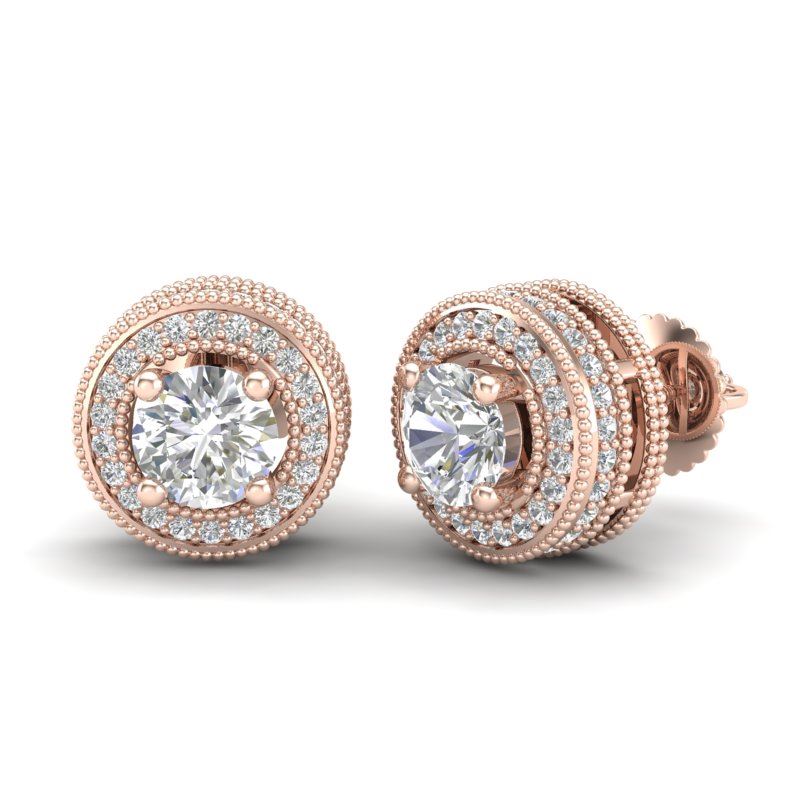 2.09 CTW VS/SI Diamond Solitaire Art Deco Stud Earrings 18K Rose Gold ---- Luxury Designer Brand Earring Appraised Retail Price at $15,400 ---- SKU Number US37140 18k Rose gold Earring Size is Larger, Earring measuring approx. Uniform, weighing in total approx. 6 grams. Made in the USA and is stamped 18k, Main stone 1.09 carat total weight containing 2 pieces of H-J color with VS/SI quality Round shape cut Diamond , Stone #2 1 carat total weight containing 96 pieces of H-I color with VS/SI quality Round shape cut