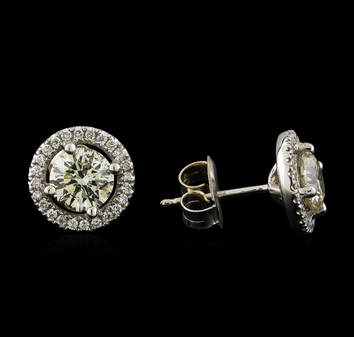 One pair electronically tested 14KT white gold cast & assembled diamond earrings with standard backs. Each earring features a round diamond solitaire set within a diamond halo. Identified with markings of "14K". Condition is new, good workmanship. Containing: One prong set round brilliant cut diamond, measuring 6.30 - 6.27 x 3.77mm (depth est.), 2.00.%. GTCF approximate weight of 0.93ct with a strong blue fluorescence. Graded in the setting. Clarity: I-1. Color: 59.9%. Table 58.5%. One prong set round brilliant cut diamond, measuring 6.30 - 6.28 x 3.80mm (depth est.) approximate weight of 0.92ct with a medium blue fluorescence. Graded in the setting. Clarity: I-1. Color: 60.4%. Table 58.8%. Forty-Eight prong set round brilliant cut diamonds, measuring 1.20 - 1.00 x 0.66mm (depth est.) approximate total weight of 48 Stones = 0.24ct. Graded in the setting. Clarity: VS-1 to VS-2. Color: G - H. Total Weight of Diamonds 2.09ct. Total Weight of Earrings 3.67gm. AIG Appraised at $14,750.00.
