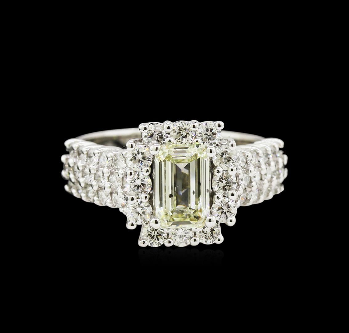 One electronically tested 14KT white gold lady's cast wedding ring with a basket halo with a bright polish finish. The featured lady's ring has a shank measuring 2.73 millimeters wide. Identified with markings of "14K". Condition is new, good workmanship. Containing: One prong set emerald cut diamond, measuring 7.50 x 4.77 x 2.80mm (depth est.) , 5.00.%. GTCF approximate weight of 1.05ct. Graded in the setting. Clarity: SI-1. Color: M - N. Cut Very Good Twelve prong set round brilliant cut diamonds, measuring 2.40 - 2.30 x 1.41mm (depth est.) approximate total weight of 12 Stones = 0.56ct. Graded in the setting. Clarity: SI-1 to I-1. Color: H - I. Cut Good Thirty prong set round brilliant cut diamonds, measuring 1.60 - 1.55 x 1.03mm (depth est.) approximate total weight of 30 Stones = 0.48ct. Graded in the setting. Clarity: SI-1 to I-1. Color: H - I. Cut Good. Total Weight of Diamonds 2.09ct. Total Weight of Ring 5.00gm. GAS Appraised at $11,580.00.