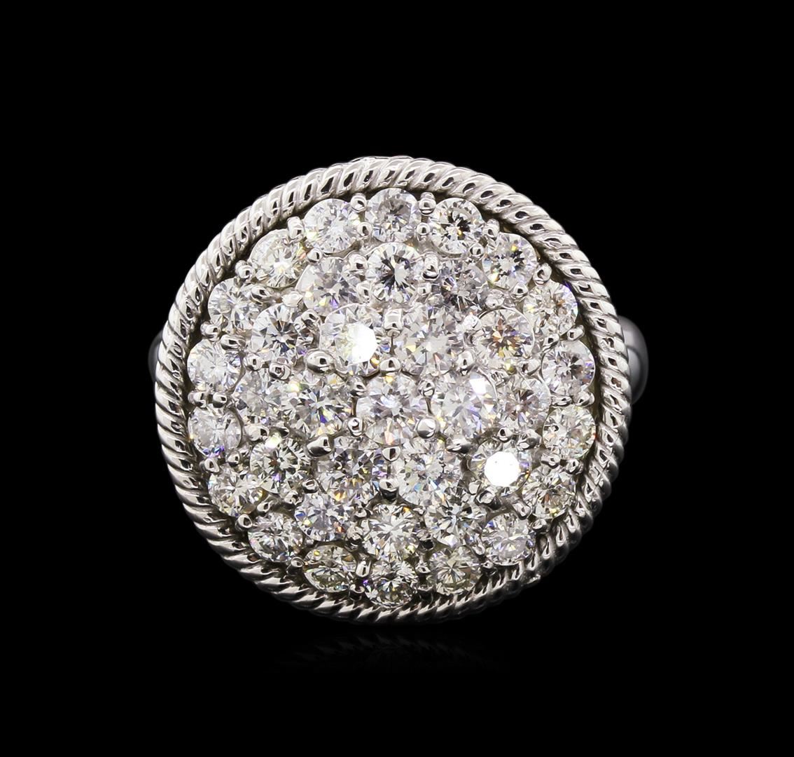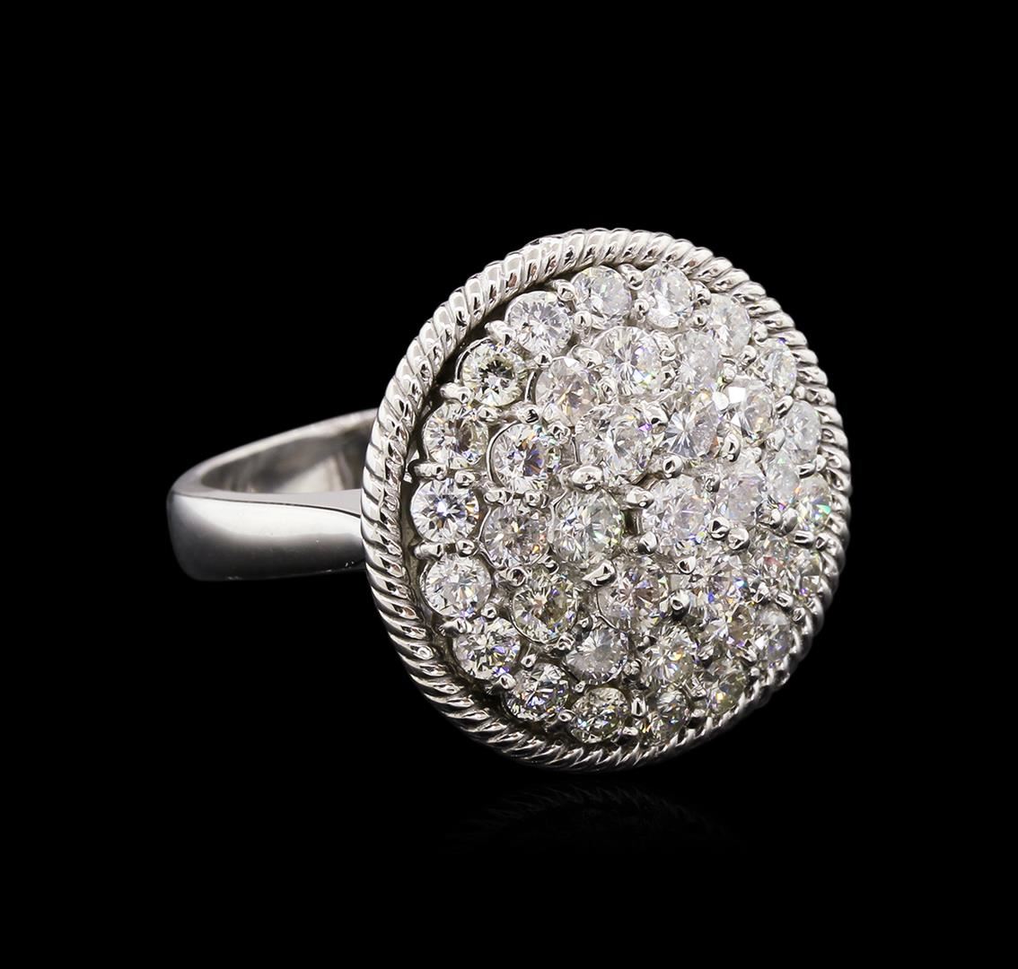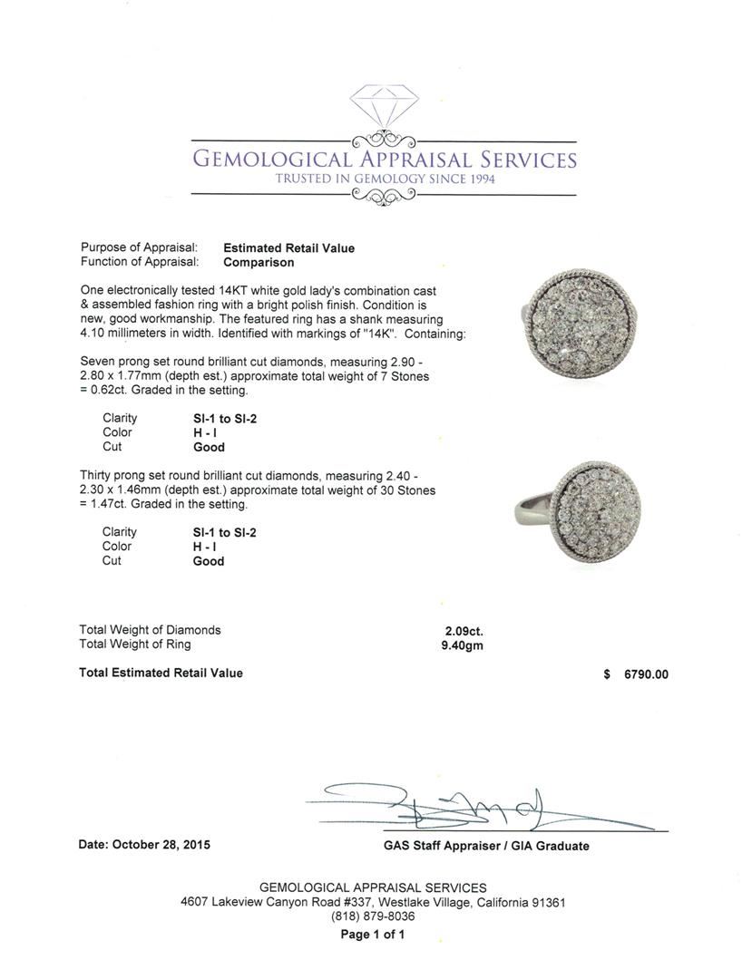 One electronically tested 14KT white gold lady's combination cast & assembled fashion ring with a bright polish finish. The featured ring has a shank measuring 4.10 millimeters in width. Identified with markings of "14K". Condition is new, good workmanship. Containing: Seven prong set round brilliant cut diamonds, measuring 2.90 - 2.80 x 1.77mm (depth est.) approximate total weight of 7 Stones = 0.62ct. Graded in the setting. Clarity: SI-1 to SI-2. Color: H - I. Cut Good Thirty prong set round brilliant cut diamonds, measuring 2.40 - 2.30 x 1.46mm (depth est.) approximate total weight of 30 Stones = 1.47ct. Graded in the setting. Clarity: SI-1 to SI-2. Color: H - I. Cut Good. Total Weight of Diamonds 2.09ct. Total Weight of Ring 9.40gm. GAS Appraised at $6,790.00.