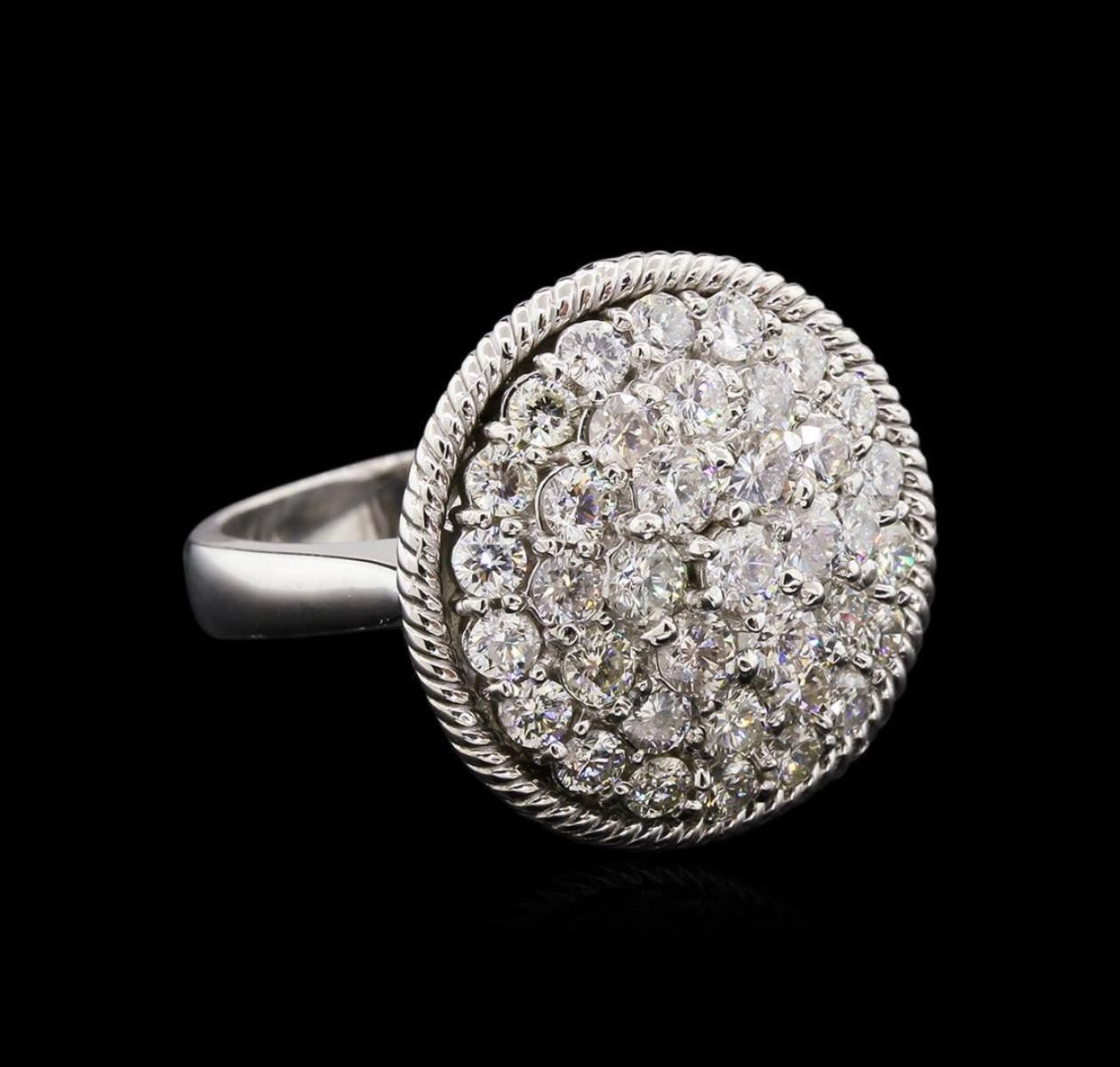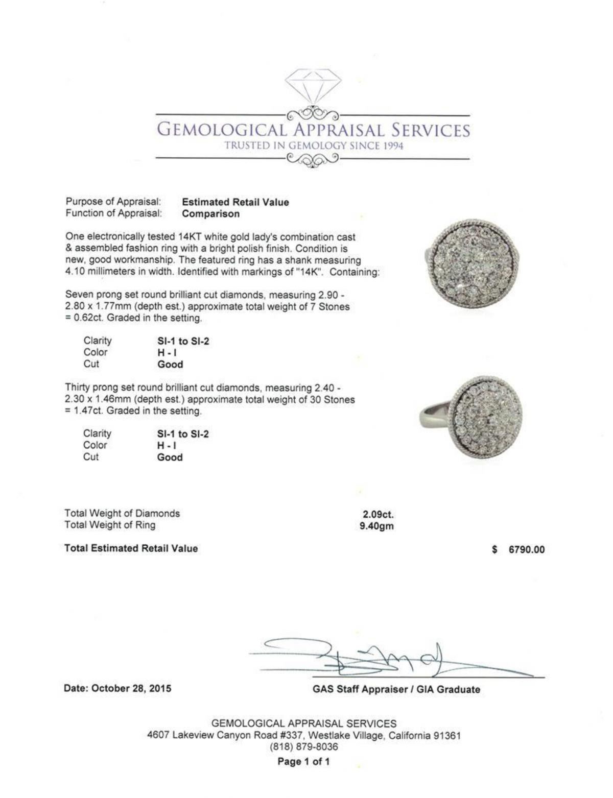 One electronically tested 14KT white gold lady's combination cast & assembled fashion ring with a bright polish finish. The featured ring has a shank measuring 4.10 millimeters in width. Identified with markings of "14K". Condition is new, good workmanship. Containing: Seven prong set round brilliant cut diamonds, measuring 2.90 - 2.80 x 1.77mm (depth est.) approximate total weight of 7 Stones = 0.62ct. Graded in the setting. Clarity: SI-1 to SI-2. Color: H - I. Cut Good Thirty prong set round brilliant cut diamonds, measuring 2.40 - 2.30 x 1.46mm (depth est.) approximate total weight of 30 Stones = 1.47ct. Graded in the setting. Clarity: SI-1 to SI-2. Color: H - I. Cut Good. Total Weight of Diamonds 2.09ct. Total Weight of Ring 9.40gm. GAS Appraised.