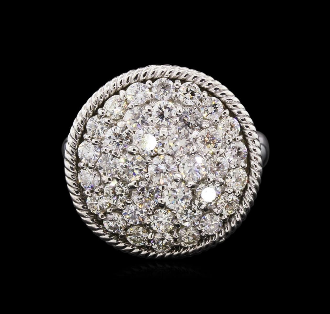 One electronically tested 14KT white gold lady's combination cast & assembled fashion ring with a bright polish finish. The featured ring has a shank measuring 4.10 millimeters in width. Identified with markings of "14K". Condition is new, good workmanship. Containing: Seven prong set round brilliant cut diamonds, measuring 2.90 - 2.80 x 1.77mm (depth est.) approximate total weight of 7 Stones = 0.62ct. Graded in the setting. Clarity: SI-1 to SI-2. Color: H - I. Cut Good Thirty prong set round brilliant cut diamonds, measuring 2.40 - 2.30 x 1.46mm (depth est.) approximate total weight of 30 Stones = 1.47ct. Graded in the setting. Clarity: SI-1 to SI-2. Color: H - I. Cut Good. Total Weight of Diamonds 2.09ct. Total Weight of Ring 9.40gm. GAS Appraised.