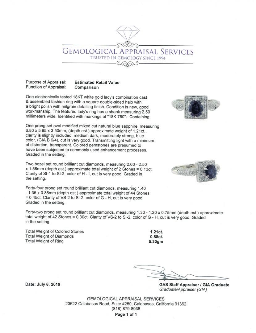 One electronically tested 18KT white gold lady's combination cast & assembled fashion ring with a square double-sided halo with a bright polish with milgrain detailing finish. The featured lady's ring has a shank measuring 2.50 millimeters wide. Identified with markings of '18K 750'. Condition is new, good workmanship. Containing: One prong set oval modified mixed cut natural blue sapphire, measuring 6.80 x 5.95 x 3.50mm, (depth est.) approximate weight of 1.21ct., clarity is slightly included, medium dark, moderately strong, blue color, (GIA B 6/4), cut is very good. Transmitting light with a minimum of distortion, transparent. Colored gemstones are presumed to have been subjected to commonly used enhancement processes. Graded in the setting. Two bezel set round brilliant cut diamonds, measuring 2.60 - 2.50 x 1.58mm (depth est.) approximate total weight of 2 Stones = 0.13ct. Graded in the setting. Color H - I Clarity SI-1 to SI-2 Cut Very Good Forty-Four prong set round brilliant cut diamonds, measuring 1.40 - 1.35 x 0.86mm (depth est.) approximate total weight of 44 Stones = 0.45ct. Graded in the setting. Color G - H Clarity VS-2 to SI-2 Cut Very Good Forty-Two prong set round brilliant cut diamonds, measuring 1.30 - 1.20 x 0.75mm (depth est.) approximate total weight of 42 Stones = 0.30ct. Graded in the setting. Color G - H Clarity VS-2 to SI-2 Cut Very Good. Total Weight of Colored Stones 1.21ct.. Total Weight of Diamonds 0.88ct.. Total Weight of Ring 5.30gm GAS Appraised at $6005.00. GAS Appraised at $6,005.00.