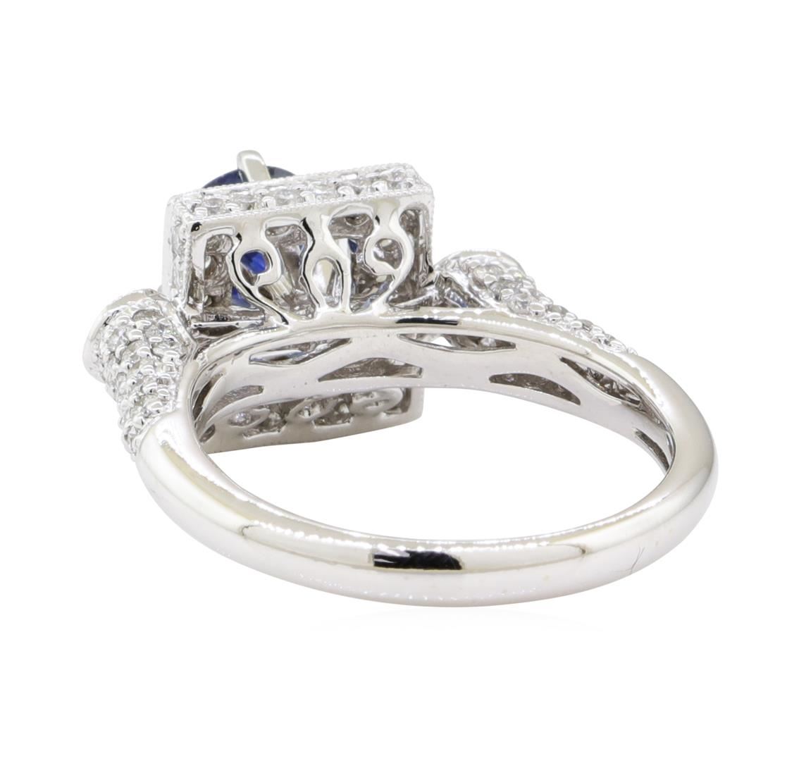 One electronically tested 18KT white gold lady's combination cast & assembled fashion ring with a square double-sided halo with a bright polish with milgrain detailing finish. The featured lady's ring has a shank measuring 2.50 millimeters wide. Identified with markings of '18K 750'. Condition is new, good workmanship. Containing: One prong set oval modified mixed cut natural blue sapphire, measuring 6.80 x 5.95 x 3.50mm, (depth est.) approximate weight of 1.21ct., clarity is slightly included, medium dark, moderately strong, blue color, (GIA B 6/4), cut is very good. Transmitting light with a minimum of distortion, transparent. Colored gemstones are presumed to have been subjected to commonly used enhancement processes. Graded in the setting. Two bezel set round brilliant cut diamonds, measuring 2.60 - 2.50 x 1.58mm (depth est.) approximate total weight of 2 Stones = 0.13ct. Graded in the setting. Color H - I Clarity SI-1 to SI-2 Cut Very Good Forty-Four prong set round brilliant cut diamonds, measuring 1.40 - 1.35 x 0.86mm (depth est.) approximate total weight of 44 Stones = 0.45ct. Graded in the setting. Color G - H Clarity VS-2 to SI-2 Cut Very Good Forty-Two prong set round brilliant cut diamonds, measuring 1.30 - 1.20 x 0.75mm (depth est.) approximate total weight of 42 Stones = 0.30ct. Graded in the setting. Color G - H Clarity VS-2 to SI-2 Cut Very Good. Total Weight of Colored Stones 1.21ct.. Total Weight of Diamonds 0.88ct.. Total Weight of Ring 5.30gm GAS Appraised at $6005.00. GAS Appraised at $6,005.00.