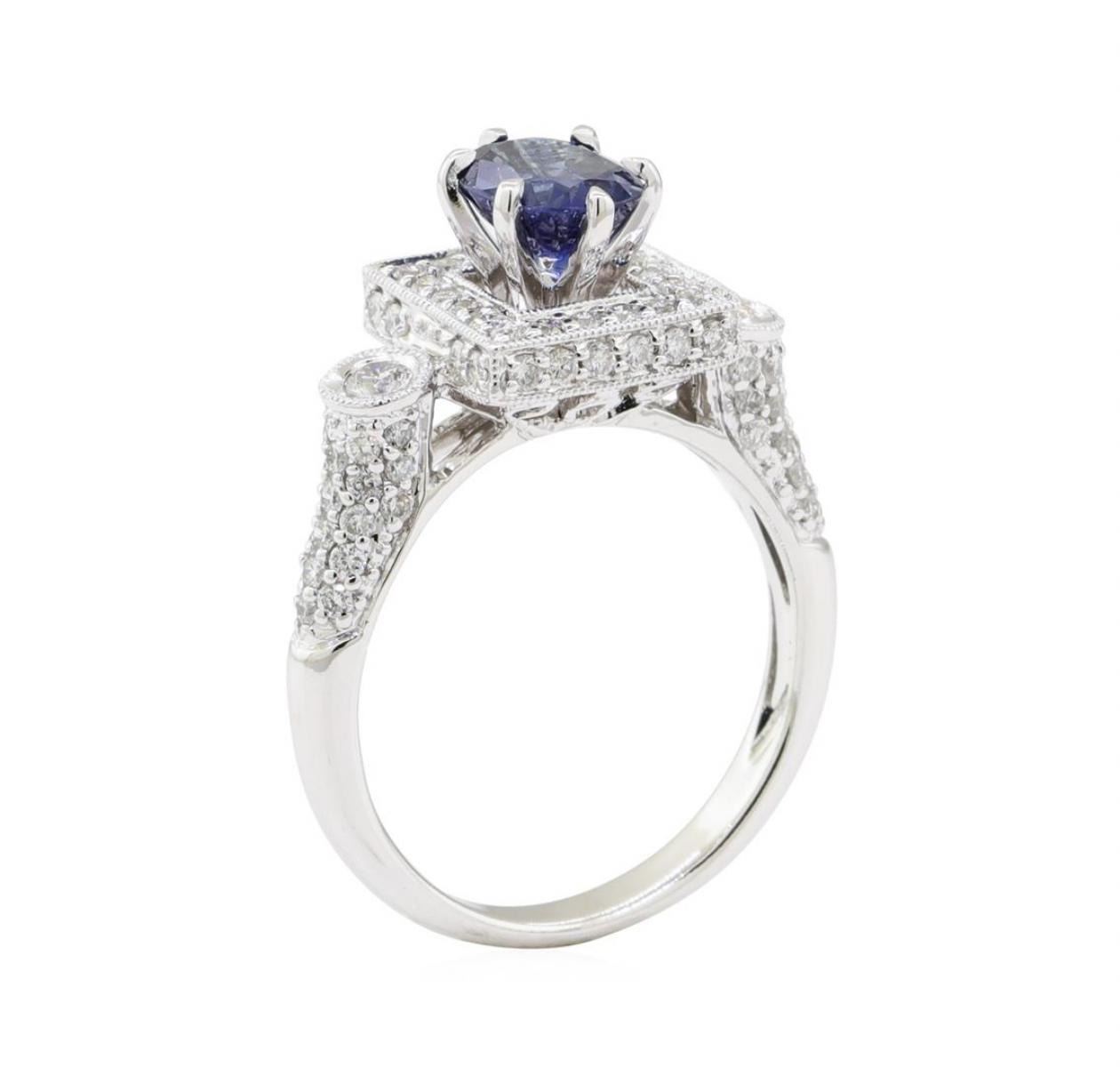 One electronically tested 18KT white gold lady's combination cast & assembled fashion ring with a square double-sided halo with a bright polish with milgrain detailing finish. The featured lady's ring has a shank measuring 2.50 millimeters wide. Identified with markings of '18K 750'. Condition is new, good workmanship. Containing: One prong set oval modified mixed cut natural blue sapphire, measuring 6.80 x 5.95 x 3.50mm, (depth est.) approximate weight of 1.21ct., clarity is slightly included, medium dark, moderately strong, blue color, (GIA B 6/4), cut is very good. Transmitting light with a minimum of distortion, transparent. Colored gemstones are presumed to have been subjected to commonly used enhancement processes. Graded in the setting. Two bezel set round brilliant cut diamonds, measuring 2.60 - 2.50 x 1.58mm (depth est.) approximate total weight of 2 Stones = 0.13ct. Graded in the setting. Color H - I Clarity SI-1 to SI-2 Cut Very Good Forty-Four prong set round brilliant cut diamonds, measuring 1.40 - 1.35 x 0.86mm (depth est.) approximate total weight of 44 Stones = 0.45ct. Graded in the setting. Color G - H Clarity VS-2 to SI-2 Cut Very Good Forty-Two prong set round brilliant cut diamonds, measuring 1.30 - 1.20 x 0.75mm (depth est.) approximate total weight of 42 Stones = 0.30ct. Graded in the setting. Color G - H Clarity VS-2 to SI-2 Cut Very Good. Total Weight of Colored Stones 1.21ct.. Total Weight of Diamonds 0.88ct.. Total Weight of Ring 5.30gm GAS Appraised at $6005.00. GAS Appraised.