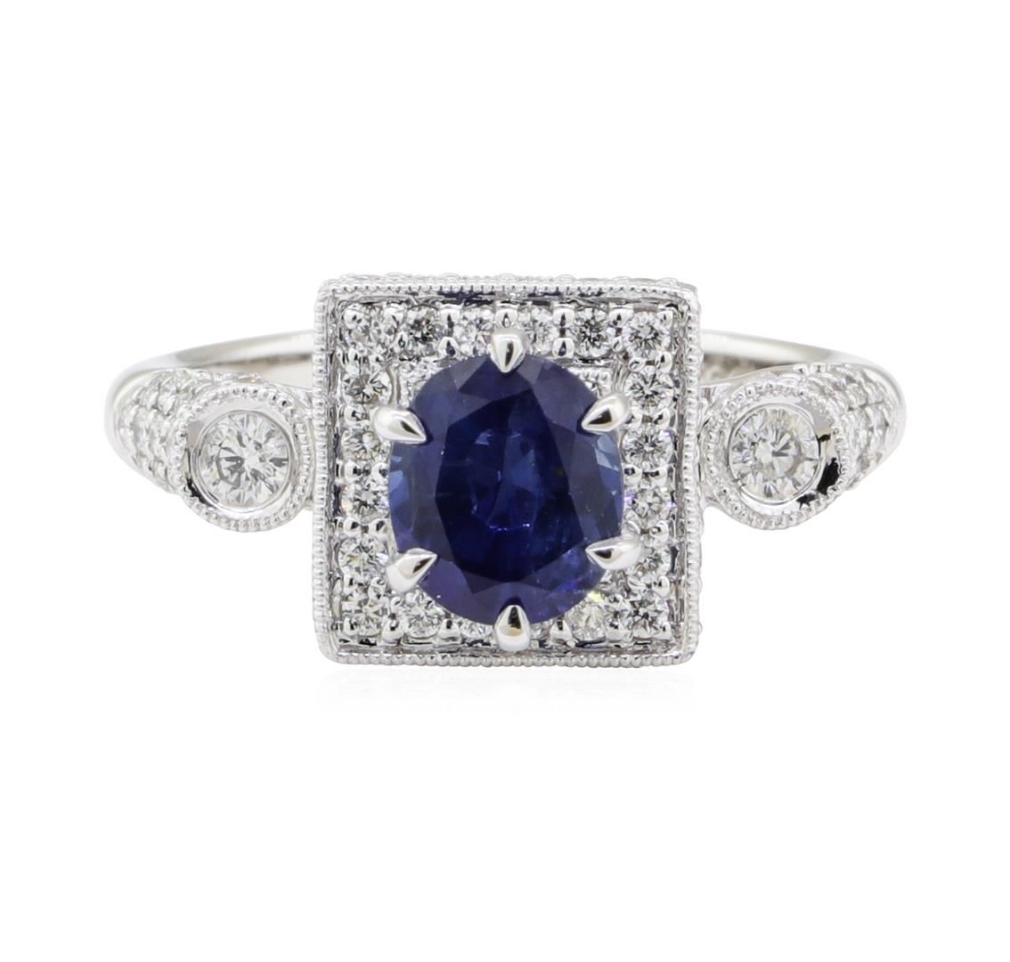 One electronically tested 18KT white gold lady's combination cast & assembled fashion ring with a square double-sided halo with a bright polish with milgrain detailing finish. The featured lady's ring has a shank measuring 2.50 millimeters wide. Identified with markings of '18K 750'. Condition is new, good workmanship. Containing: One prong set oval modified mixed cut natural blue sapphire, measuring 6.80 x 5.95 x 3.50mm, (depth est.) approximate weight of 1.21ct., clarity is slightly included, medium dark, moderately strong, blue color, (GIA B 6/4), cut is very good. Transmitting light with a minimum of distortion, transparent. Colored gemstones are presumed to have been subjected to commonly used enhancement processes. Graded in the setting. Two bezel set round brilliant cut diamonds, measuring 2.60 - 2.50 x 1.58mm (depth est.) approximate total weight of 2 Stones = 0.13ct. Graded in the setting. Color H - I Clarity SI-1 to SI-2 Cut Very Good Forty-Four prong set round brilliant cut diamonds, measuring 1.40 - 1.35 x 0.86mm (depth est.) approximate total weight of 44 Stones = 0.45ct. Graded in the setting. Color G - H Clarity VS-2 to SI-2 Cut Very Good Forty-Two prong set round brilliant cut diamonds, measuring 1.30 - 1.20 x 0.75mm (depth est.) approximate total weight of 42 Stones = 0.30ct. Graded in the setting. Color G - H Clarity VS-2 to SI-2 Cut Very Good. Total Weight of Colored Stones 1.21ct.. Total Weight of Diamonds 0.88ct.. Total Weight of Ring 5.30gm GAS Appraised at $6005.00. GAS Appraised.