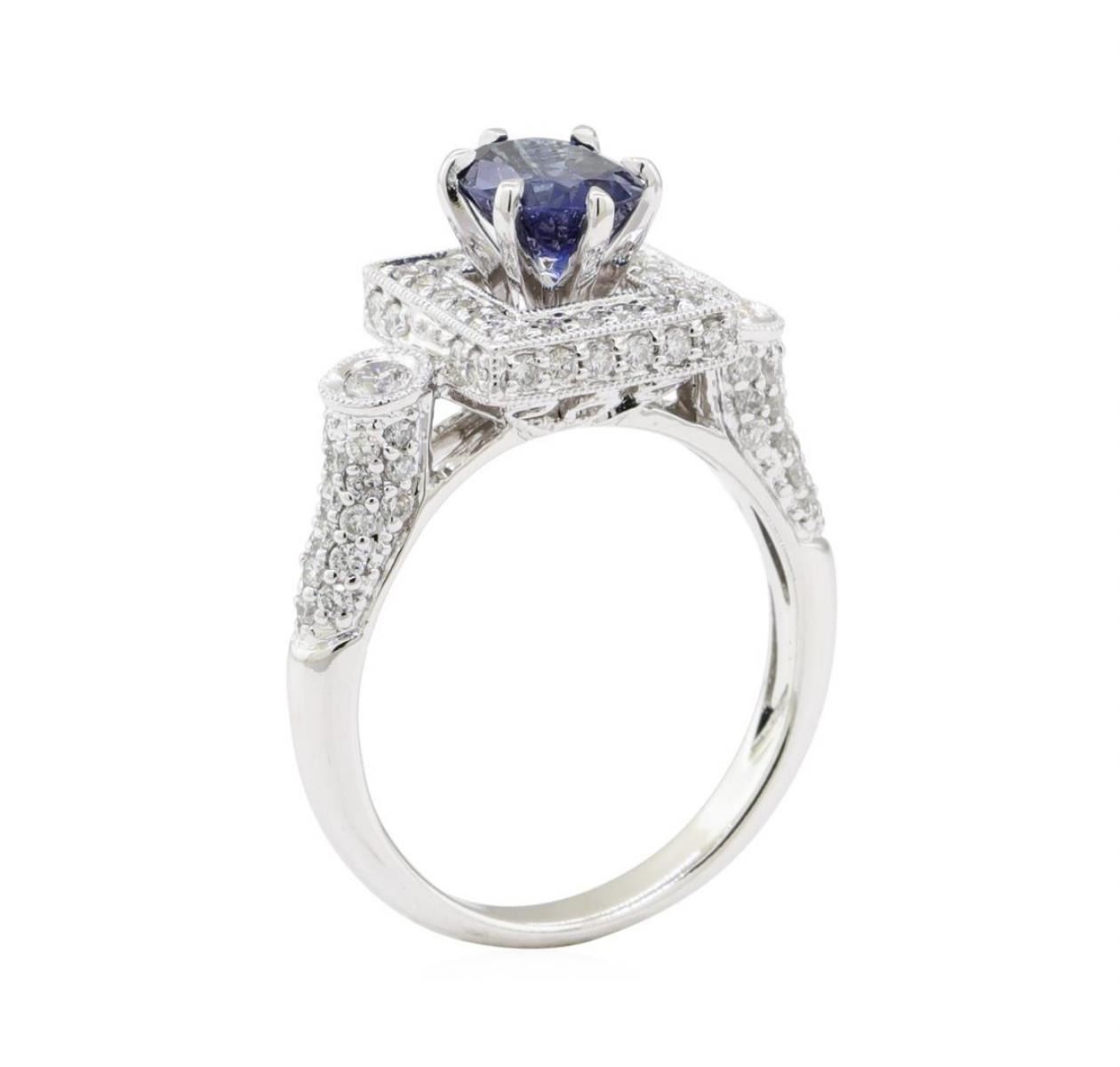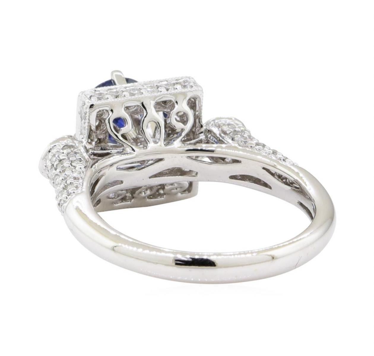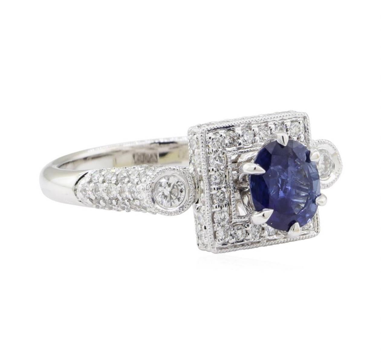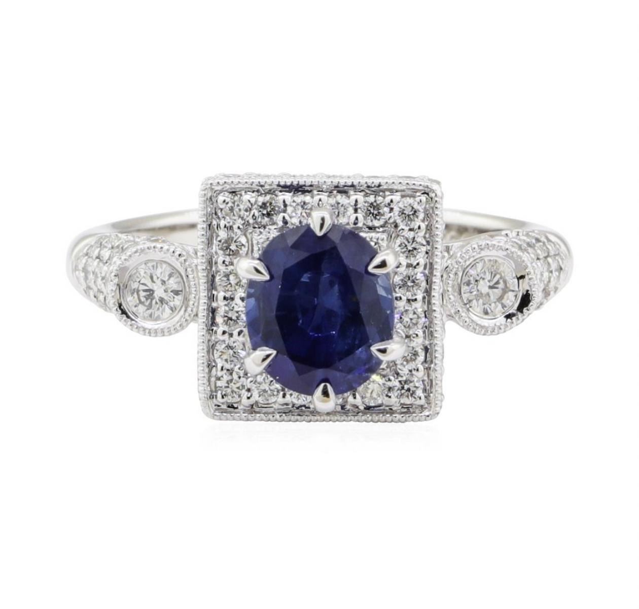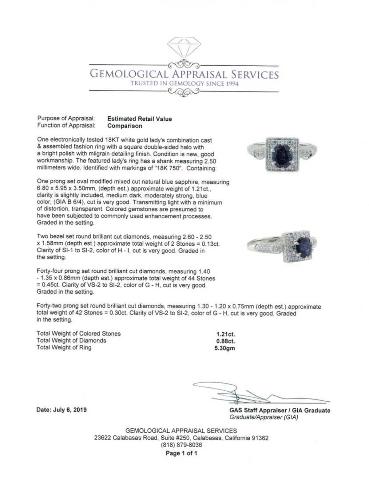 One electronically tested 18KT white gold lady's combination cast & assembled fashion ring with a square double-sided halo with a bright polish with milgrain detailing finish. The featured lady's ring has a shank measuring 2.50 millimeters wide. Identified with markings of '18K 750'. Condition is new, good workmanship. Containing: One prong set oval modified mixed cut natural blue sapphire, measuring 6.80 x 5.95 x 3.50mm, (depth est.) approximate weight of 1.21ct., clarity is slightly included, medium dark, moderately strong, blue color, (GIA B 6/4), cut is very good. Transmitting light with a minimum of distortion, transparent. Colored gemstones are presumed to have been subjected to commonly used enhancement processes. Graded in the setting. Two bezel set round brilliant cut diamonds, measuring 2.60 - 2.50 x 1.58mm (depth est.) approximate total weight of 2 Stones = 0.13ct. Graded in the setting. Color H - I Clarity SI-1 to SI-2 Cut Very Good Forty-Four prong set round brilliant cut diamonds, measuring 1.40 - 1.35 x 0.86mm (depth est.) approximate total weight of 44 Stones = 0.45ct. Graded in the setting. Color G - H Clarity VS-2 to SI-2 Cut Very Good Forty-Two prong set round brilliant cut diamonds, measuring 1.30 - 1.20 x 0.75mm (depth est.) approximate total weight of 42 Stones = 0.30 ct. Graded in the setting. Color G - H Clarity VS-2 to SI-2 Cut Very Good. Total Weight of Colored Stones 1.21ct.. Total Weight of Diamonds 0.88ct.. Total Weight of Ring 5.30gm GAS Appraised at $6005.00. GAS Appraised.