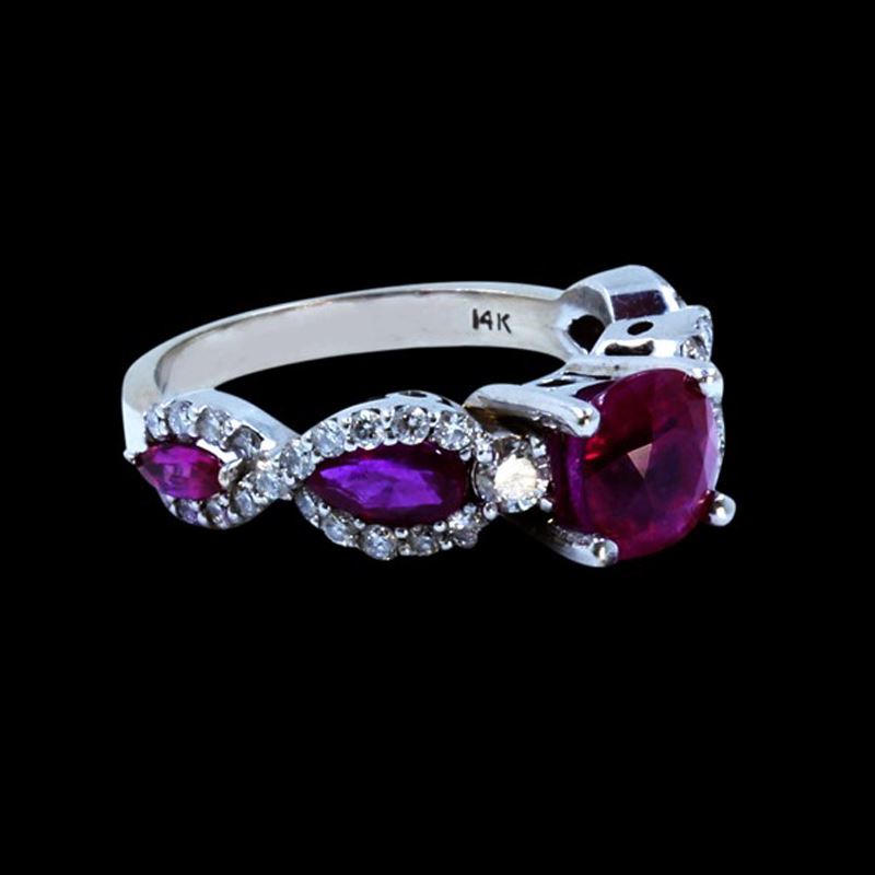 14K WHITE GOLD NATURAL RUBY RING:4.93 GRAMS/DIAMOND:0.64CT/RUBY(SIDESTONE):1.29CT/RUBY(MAINSTONE):2.09CT/#GVR1109/NO GLASS OR LEAD FILLING