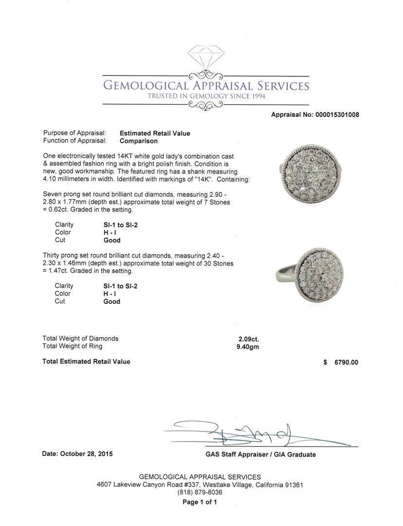 One electronically tested 14KT white gold lady's combination cast & assembled fashion ring with a bright polish finish. The featured ring has a shank measuring 4.10 millimeters in width. Identified with markings of "14K". Condition is new, good workmanship. Containing: Seven prong set round brilliant cut diamonds, measuring 2.90 - 2.80 x 1.77mm (depth est.) approximate total weight of 7 Stones = 0.62ct. Graded in the setting. Clarity: SI-1 to SI-2. Color: H - I. Cut Good Thirty prong set round brilliant cut diamonds, measuring 2.40 - 2.30 x 1.46mm (depth est.) approximate total weight of 30 Stones = 1.47ct. Graded in the setting. Clarity: SI-1 to SI-2. Color: H - I. Cut Good. Total Weight of Diamonds 2.09ct. Total Weight of Ring 9.40gm. GAS Appraised at $6,790.00.