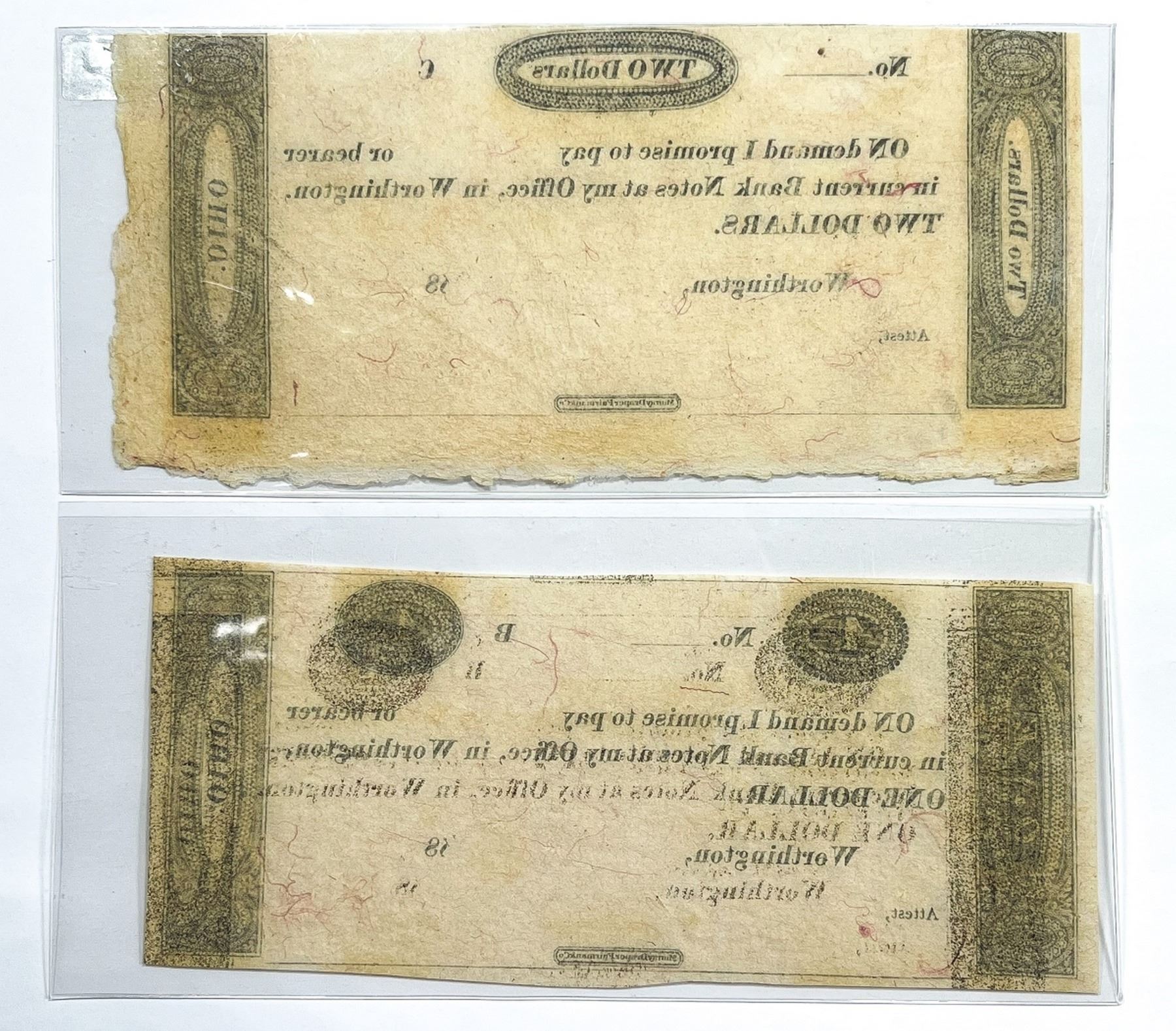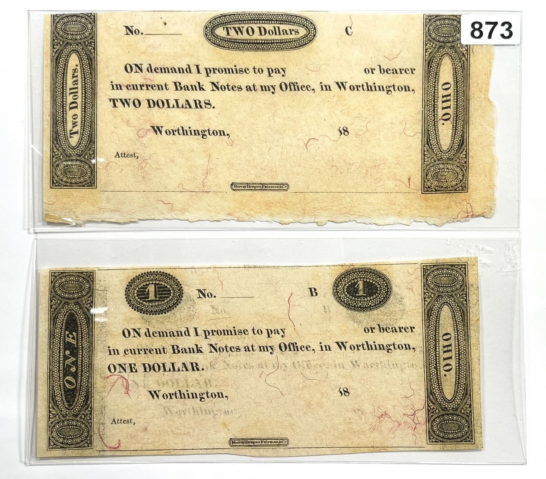 (2) $1 & $2 Bank Scripts of Worthington, OH -