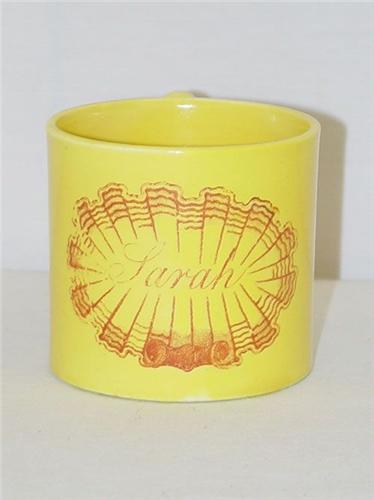 2 1/2" CANARY YELLOW STAFFORDSHIRE CHILDS MUG W/ SEPIA DECORATION-"SARAH"