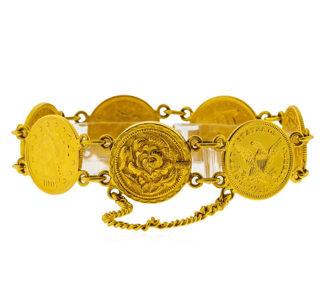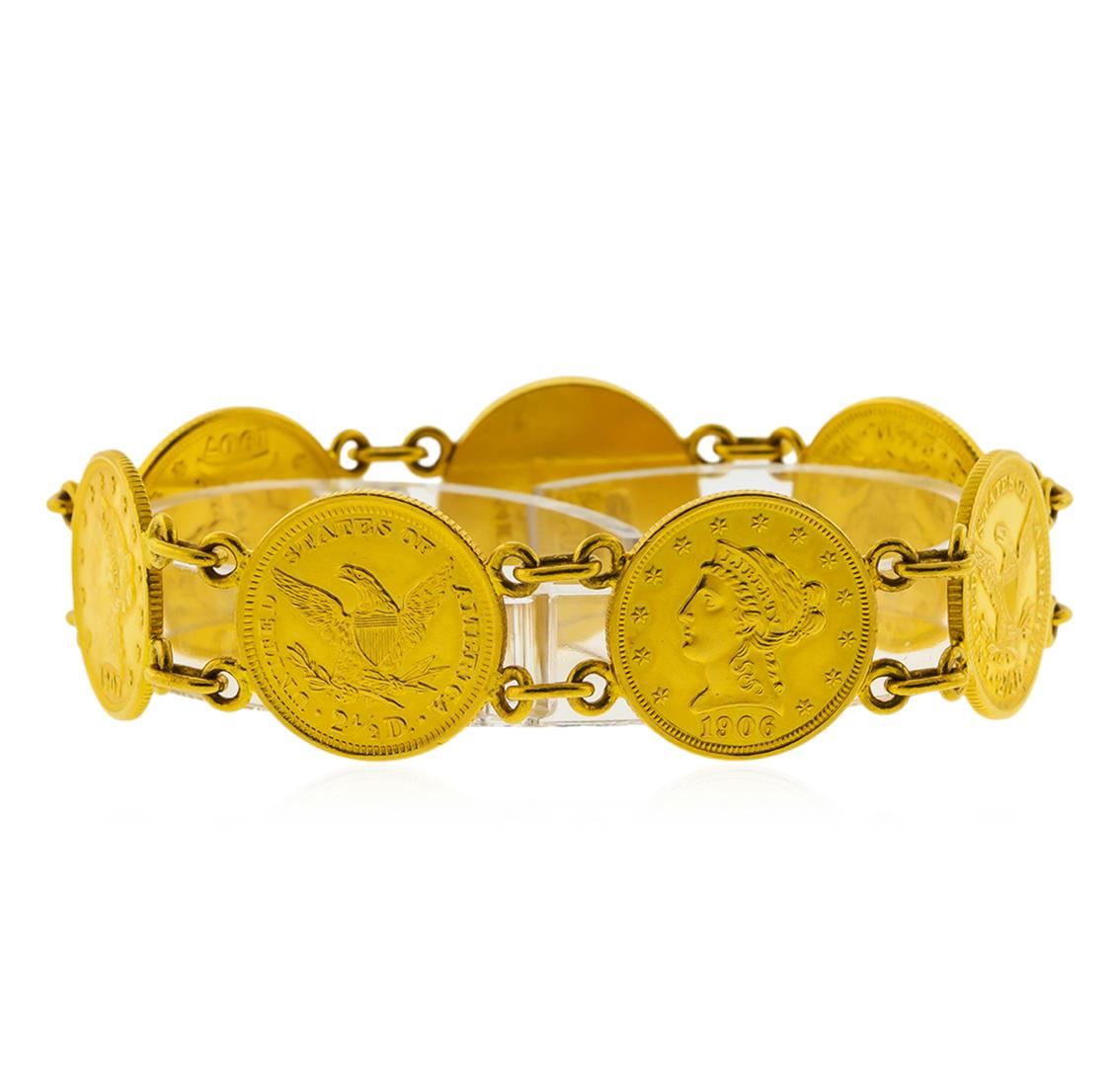 One $2 1/2 Liberty Head Quarter Eagle Gold Coin Bracelet. The total weight of bracelet is 41.5 grams. Bracelet contains six 2 1/2 dollar Liberty head quarter eagles. (1) 1902 coin, (1) 1903 coin, (1) 1906 coin, and (3) 1907 coins.