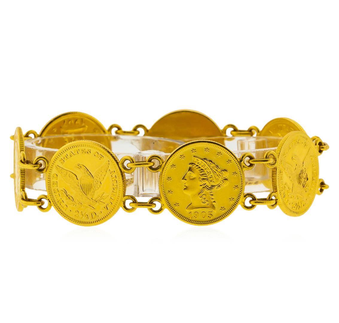 One $2 1/2 Liberty Head Quarter Eagle Gold Coin Bracelet. The total weight of bracelet is 41.5 grams. Bracelet contains six 2 1/2 dollar Liberty head quarter eagles. (1) 1851 coin, (1) 1878 coin, (1) 1903 coin, (1) 1905 Coin, and (2) 1907 coins.