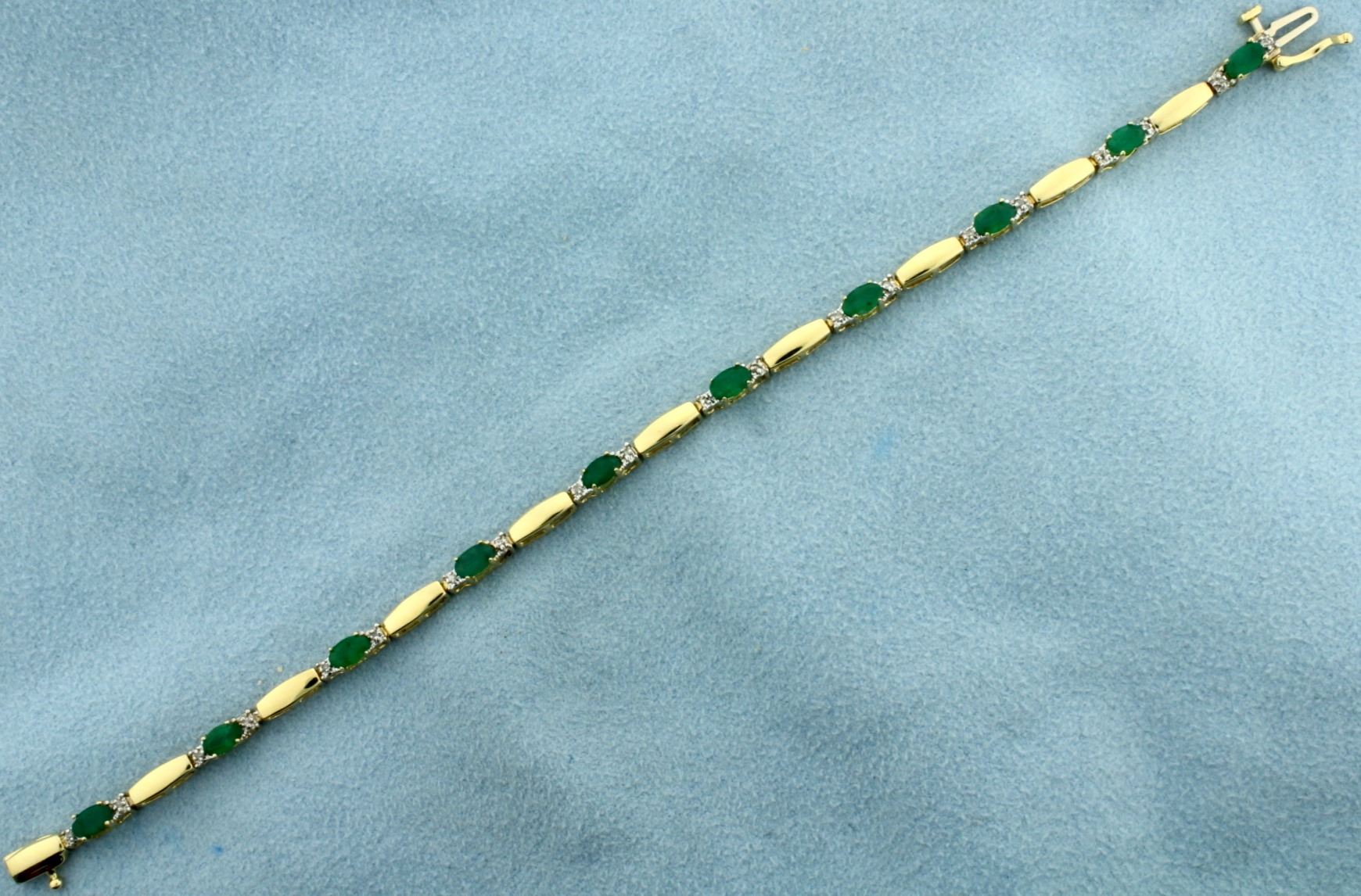 In 14k yellow gold. Contains ten natural 5x3mm high quality emerald gemstones with bright green color and excellent clarity. Also contains twenty high quality .01ct diamonds. 7" long with safety clasp. 6.0g.