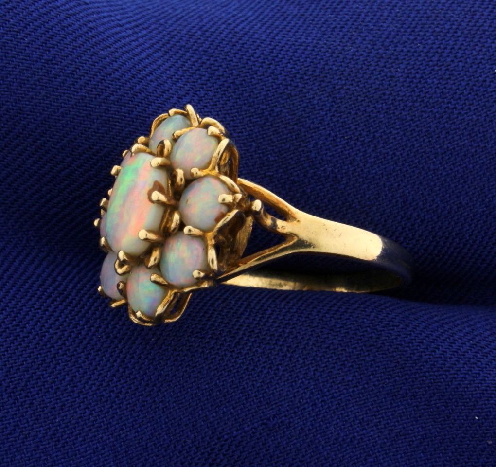 8ct yellow gold, containing one 8 by 6 oval and 8 4mm round opals with excellent play of color. Size 6 1/2. 4.3g.