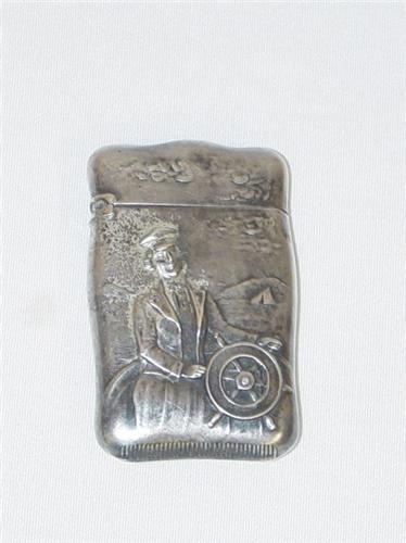2 1/4" STERLING MATCH SAFE W/ REPOUSSE NAUTICAL MOTIF ON BOTH SIDES MAN AT SHIPS WHEEL W/ SEASCAPE IN DISTANCE-MARKED ONLY STERLING - WEAR & TARNISHED