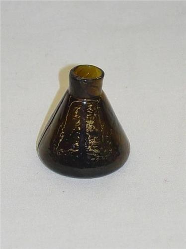 2 1/4" STODDARD CONE INK OLIVE AMBER W/ PONTIL - 1" CRACK BRUISE FROM NECK TO SHOULDER;