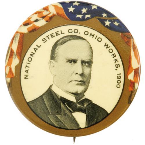 <B>Dramatic Large 2 1/8" William McKinley Button with Ohio Steel Company Advertising.</B></I> We cannot recall ever seeing another, and the condition is great. Clearly one of the best political/advertising pins of this era. <I>From the Norman Loewenstern Collection.</B></I>