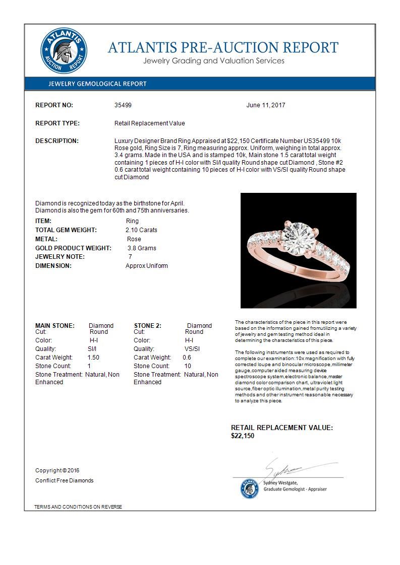 2.1 CTW H-SI/I Certified Diamond Solitaire Ring 10K Rose Gold ---- Luxury Designer Brand Ring Appraised Retail Price at $22,150 ---- SKU Number US35499 10k Rose gold Ring Size is 7, Ring measuring approx. Uniform, weighing in total approx. 3.4 grams. Made in the USA and is stamped 10k, Main stone 1.50 carat total weight containing 1 pieces of H-I color with SI/I quality Round shape cut Diamond , Stone #2 0.6 carat total weight containing 10 pieces of H-I color with VS/SI quality Round shape cut