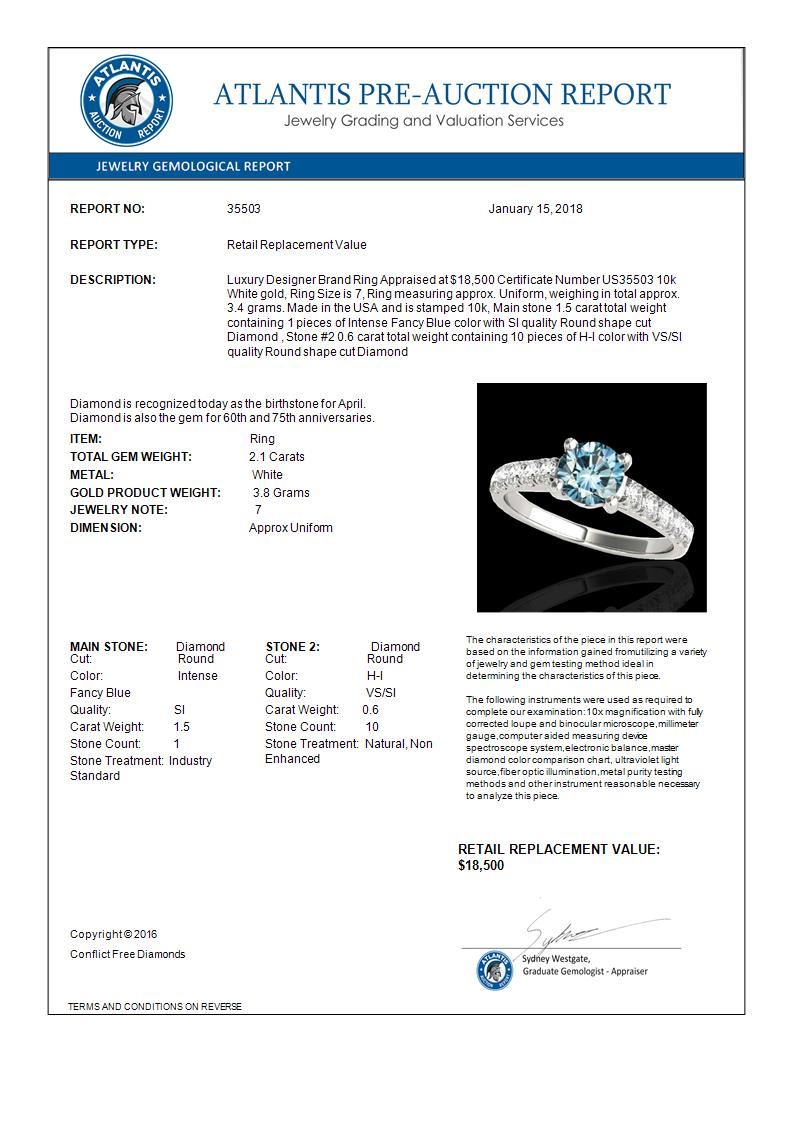 REF-280Y2K -35503 ---- 2.1 CTW Si Certified Fancy Blue Diamond Solitaire Ring 10K White Gold ---- Luxury Designer Brand Ring Appraised at $18,500 Certificate Number US35503 10k White gold, Ring Size is 7, Ring measuring approx. Uniform, weighing in total approx. 3.4 grams. Made in the USA and is stamped 10k, Main stone 1.5 carat total weight containing 1 pieces of Intense Fancy Blue color with SI quality Round shape cut Diamond , Stone #2 0.6 carat total weight containing 10 pieces of H-I color with VS/SI quality Round shape cut Diamond