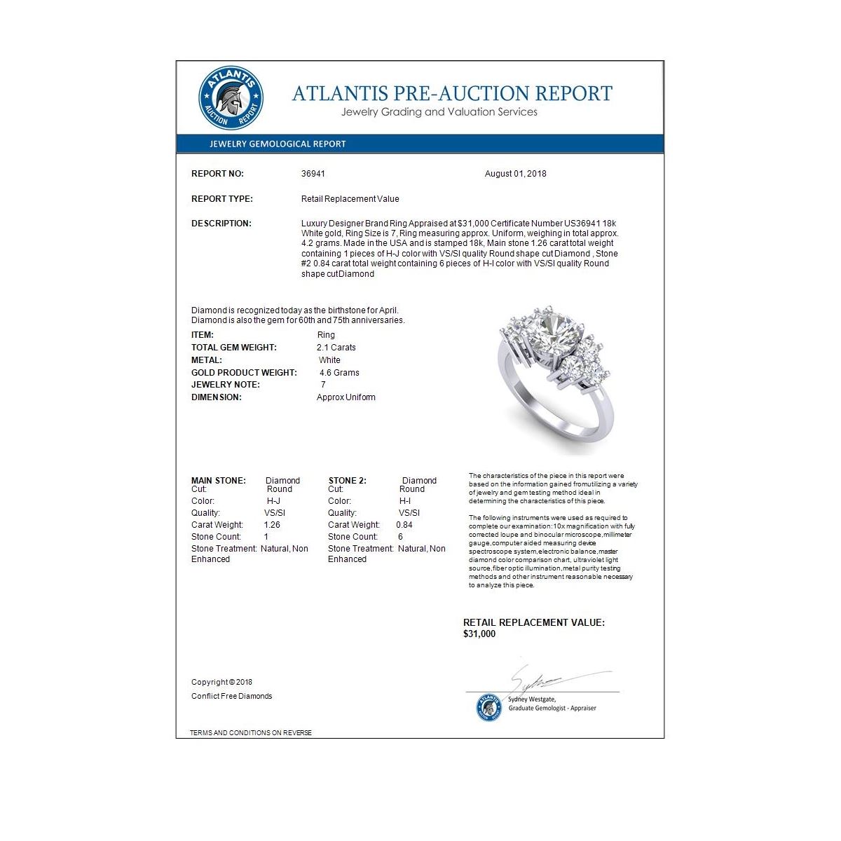 REF-563Y6K -36941 ---- 2.1 CTW VS/SI Diamond Solitaire Ring 18K White Gold ---- Luxury Designer Brand Ring Appraised at $31,000 Certificate Number US36941 18k White gold, Ring Size is 7, Ring measuring approx. Uniform, weighing in total approx. 4.2 grams. Made in the USA and is stamped 18k, Main stone 1.26 carat total weight containing 1 pieces of H-J color with VS/SI quality Round shape cut Diamond , Stone #2 0.84 carat total weight containing 6 pieces of H-I color with VS/SI quality Round shape cut Diamond