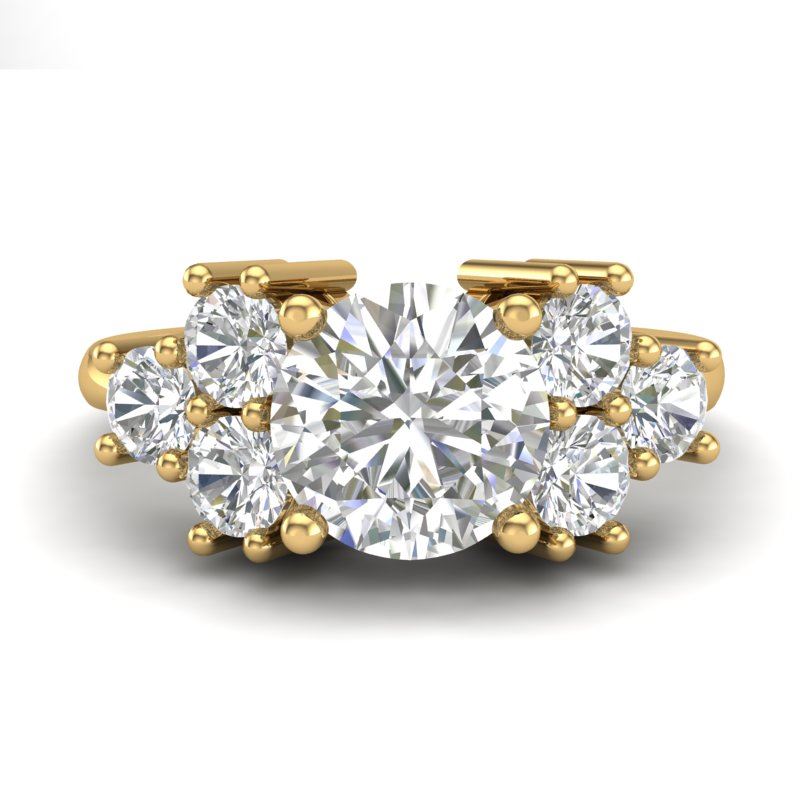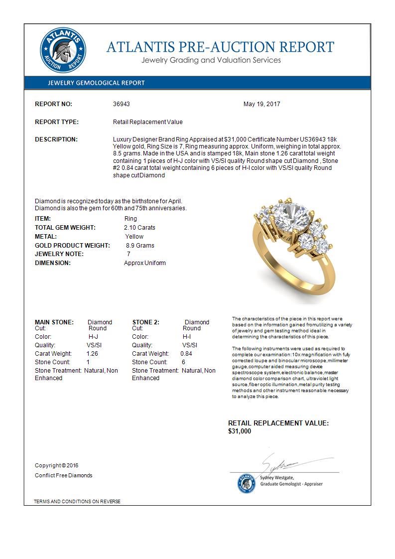 2.1 CTW VS/SI Diamond Solitaire Ring 18K Yellow Gold ---- Luxury Designer Brand Ring Appraised Retail Price at $31,000 ---- SKU Number US36943 18k Yellow gold Ring Size is 7, Ring measuring approx. Uniform, weighing in total approx. 8.5 grams. Made in the USA and is stamped 18k, Main stone 1.26 carat total weight containing 1 pieces of H-J color with VS/SI quality Round shape cut Diamond , Stone #2 0.84 carat total weight containing 6 pieces of H-I color with VS/SI quality Round shape cut