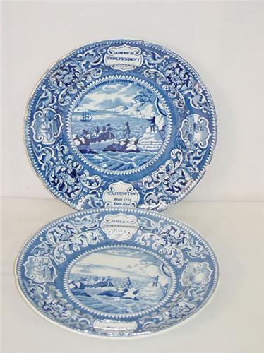 (2) 10 1/4" STAFFORDSHIRE BLUE & WHITE AMERICA INDEPENDENT PLATES-ENOCH WOODS & SON - VERY MINOR SURFACE SCRATCHES & 1 SMALL RIM CHIP