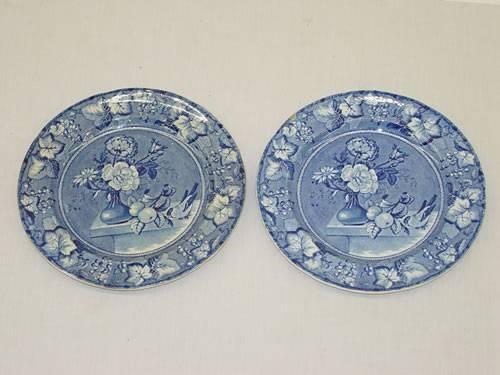 (2) 10" BLUE STAFFORDSHIRE PLATES-CORONATION PATTERN BY CLEWS - (1) W/ FRONT RIM CHIP, (1) W/ BACK BASE RIM CHIP & STAINS