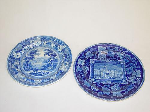 (2) 10" BLUE STAFFORDSHIRE PLATES W/ ENGLISH VIEWS: GLANBRAN HOUSE-CARMARTHENSHIRE & ST. PHILIPS CHAPEL- REGENT ST. (IMPRESSED "WOOD") - LIGHT WEAR & SCRATCHING
