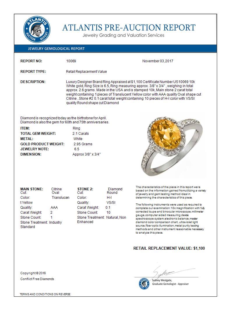 REF-18M2H -10069 ---- 2.10 CTW Citrine & Diamond Ring 10K White Gold ---- Luxury Designer Brand Ring Appraised at $1,100 Certificate Number US10069 10k White gold, Ring Size is 6.5, Ring measuring approx. 3/8" x 3/4" , weighing in total approx. 2.6 grams. Made in the USA and is stamped 10k, Main stone 2 carat total weight containing 1 pieces of Translucent Yellow color with AAA quality Oval shape cut Citrine , Stone #2 0.1 carat total weight containing 10 pieces of H-I color with VS/SI quality Round shape cut Diamond